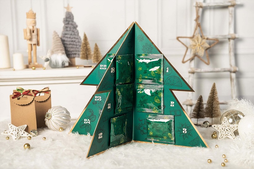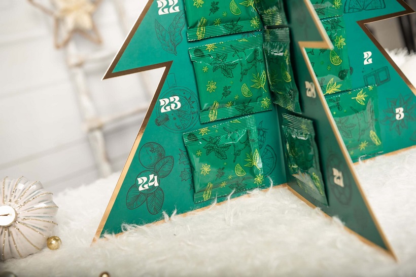 Kalendarz stojący trójwymiarowa choinka z saszetkami herbat liściastych.