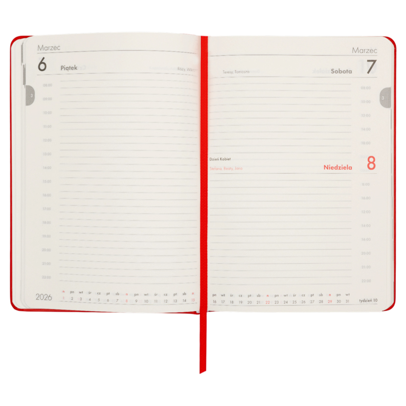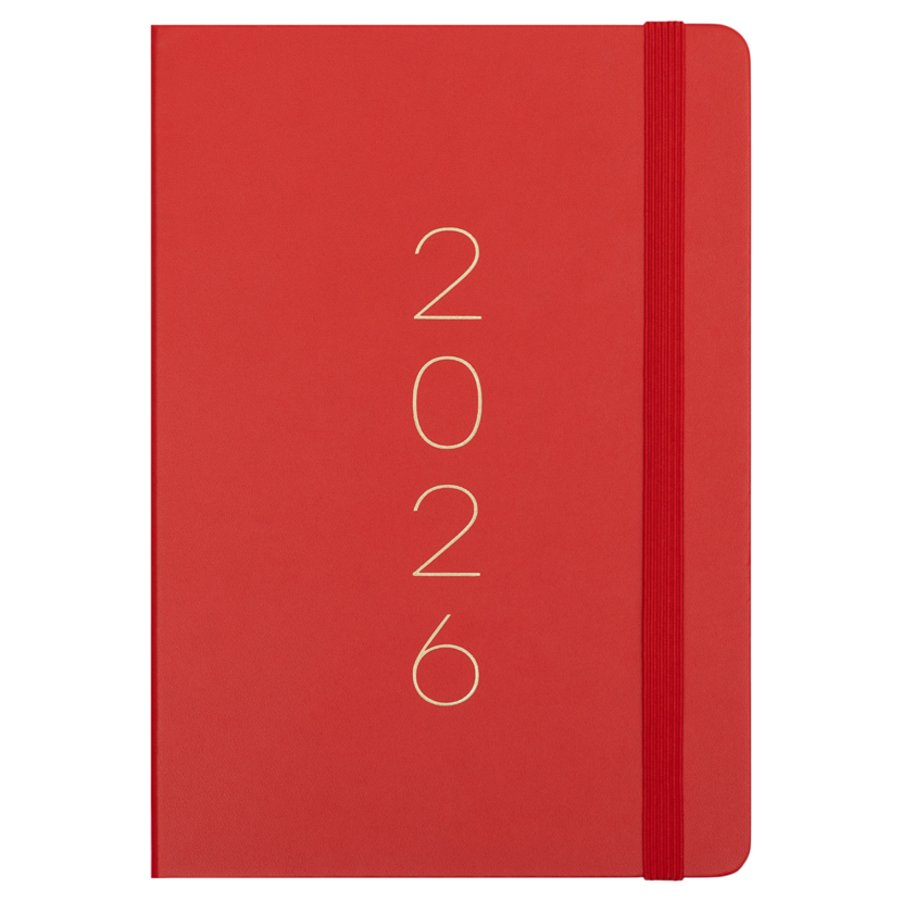 Twarda, czerwona okładka nadaje mu klasyczny i ponadczasowy wygląd, a złoty nadruk roku 2026 umieszczony pionowo na środku dodaje subtelnego blasku. Czerwona gumka umożliwia wygodne zapięcie kalendarza, dzięki czemu wszystkie notatki pozostają na swoim miejscu. Na szczycie kalendarza znajduje się wszyta czerwona tasiemka, która umożliwia szybkie zaznaczanie i łatwe odnajdywanie stron. Format A5 (139 × 200 mm) sprawia, że kalendarz jest poręczny, czytelny i wygodny w codziennym użytkowaniu – zarówno w pracy, jak i w domu.