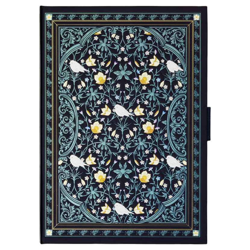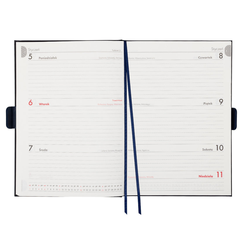 Granatowa okładka ozdobiona wzorem gałązek i liści wokół krawędzi nadaje mu wyjątkowo estetyczny i harmonijny wygląd. Wewnątrz okładki znajdują się delikatne motywy kwiatów i ptaków, które wprowadzają lekki, naturalny klimat. Zapięcie na magnes zapewnia wygodę i chroni wnętrze kalendarza, a granatowa wstążka pozwala łatwo zaznaczyć aktualny dzień. Dzięki formatowi A5 (148 × 210 mm) kalendarz jest poręczny i idealny do codziennego użytku – zarówno w biurze, jak i w podróży.