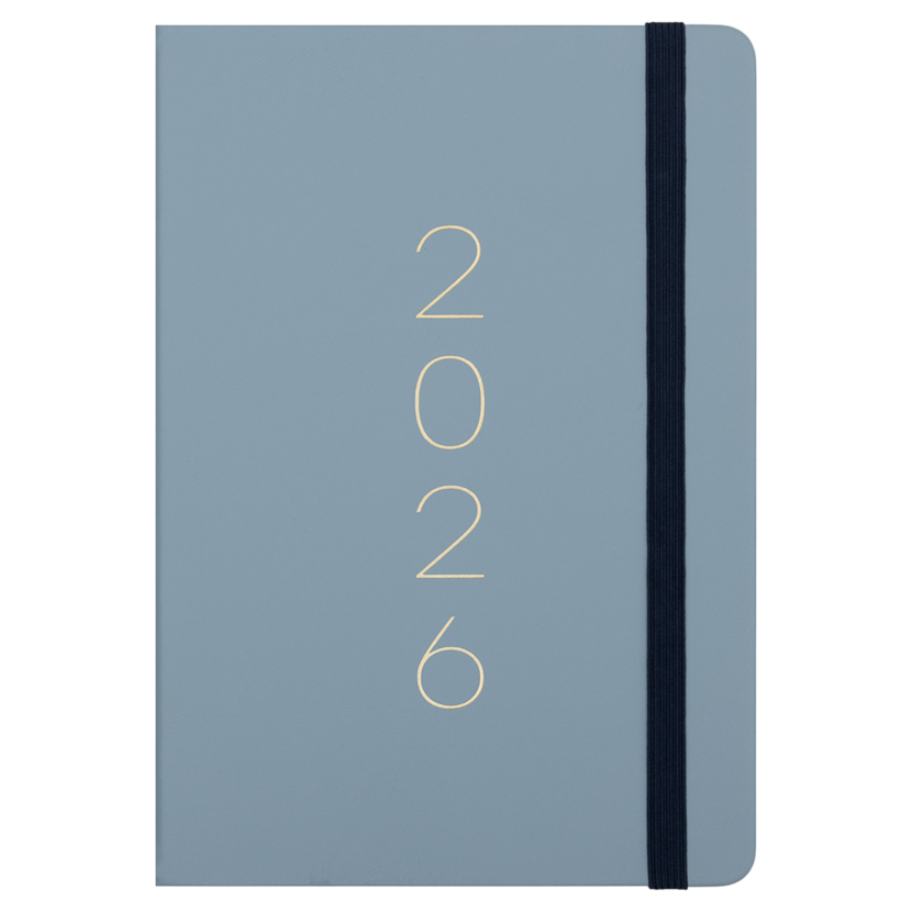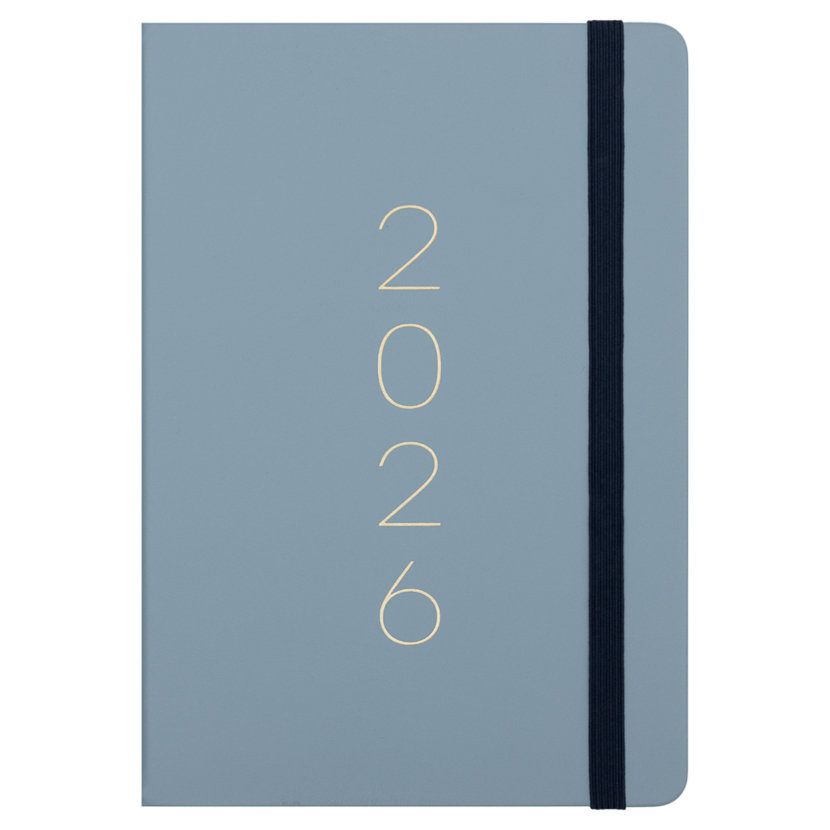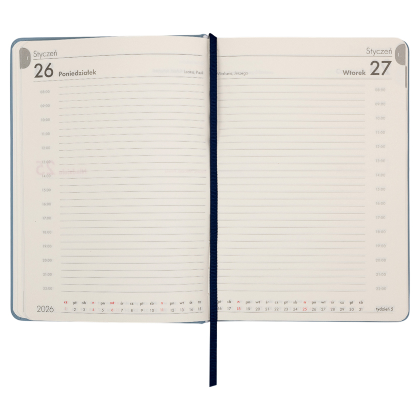 Twarda, błękitna okładka nadaje mu klasyczny i ponadczasowy wygląd, a złoty nadruk roku 2026 umieszczony pionowo na środku dodaje subtelnego blasku. Granatowa gumka umożliwia wygodne zapięcie kalendarza, dzięki czemu wszystkie notatki pozostają na swoim miejscu. Na szczycie kalendarza znajduje się wszyta granatowa tasiemka, która umożliwia szybkie zaznaczanie i łatwe odnajdywanie stron.Format A5 (139 × 200 mm) sprawia, że kalendarz jest poręczny, czytelny i wygodny w codziennym użytkowaniu – zarówno w pracy, jak i w domu.
