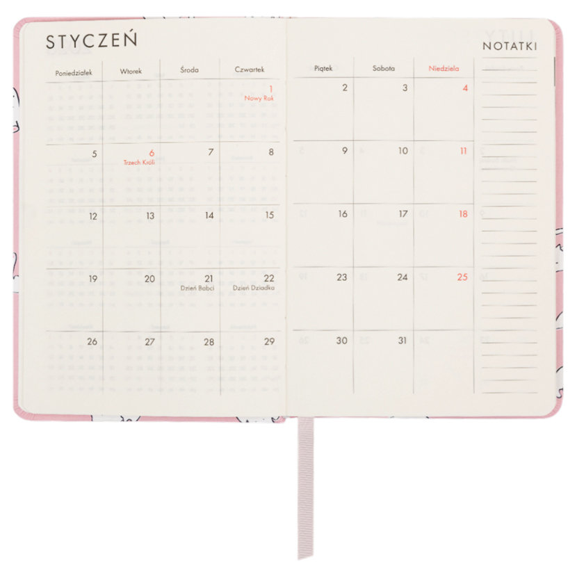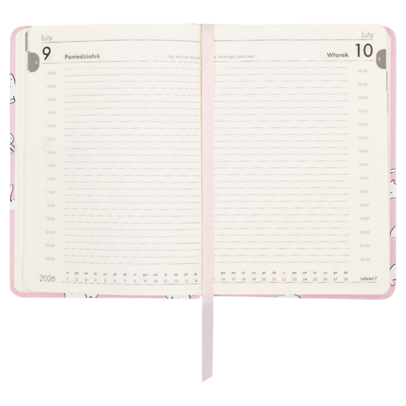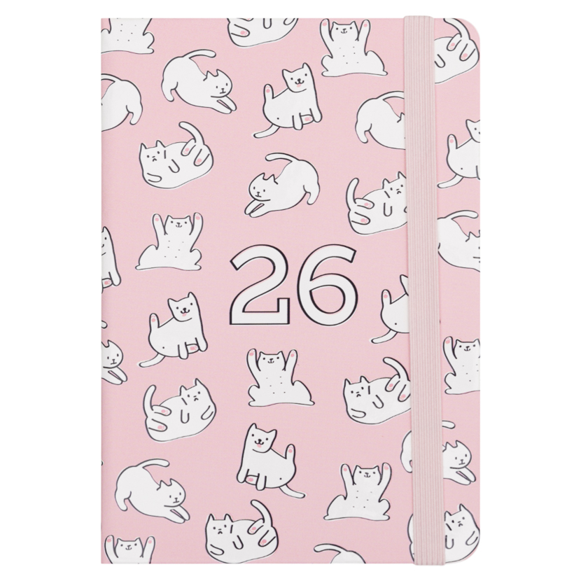 Jasnoróżowa twarda okładka zdobiona grafikami białych kotków w różnych pozycjach przyciąga wzrok i nadaje kalendarzowi radosny, przyjemny charakter. Na środku okładki znajduje się rok „2026”, a jasnoróżowa pastelowa gumka umożliwia zapięcie kalendarza, a wszyta jasnoróżowa tasiemka ułatwia szybkie zaznaczanie stron i odnajdywanie bieżącego dnia. Format B6 (160 × 110 mm) sprawia, że kalendarz jest poręczny i wygodny w codziennym użytkowaniu.
