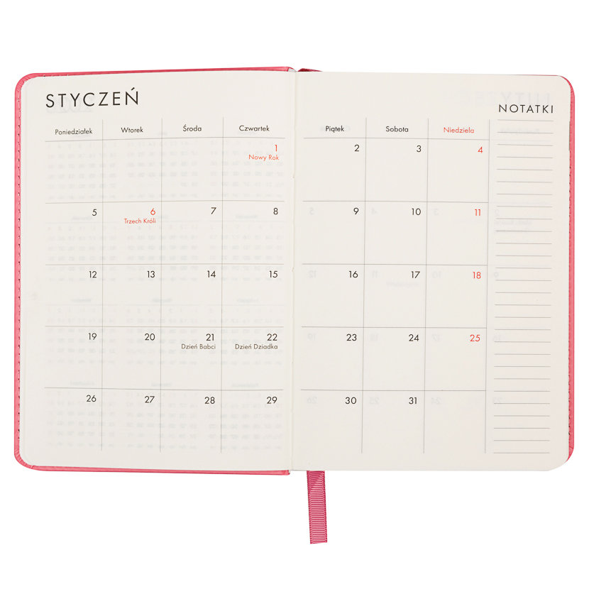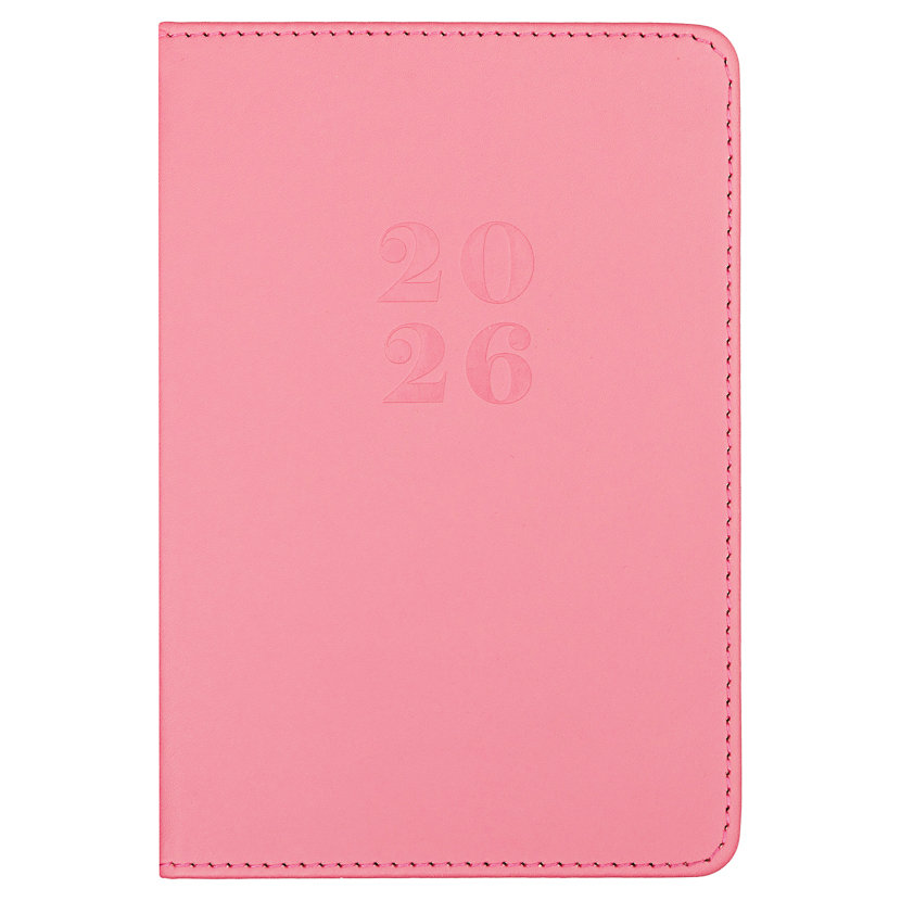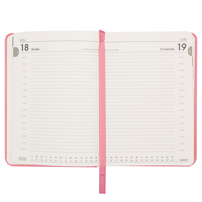 Twarda, różowa okładka z przeszyciem na krawędziach nadaje kalendarzowi trwałość i styl, a wytłoczony napis 2026 subtelnie podkreśla jego charakter. Na szczycie kalendarza znajduje się wszyta różowa tasiemka, która umożliwia szybkie zaznaczanie i łatwe odnajdywanie stron. Format B6 (160 × 110 mm) sprawia, że kalendarz jest poręczny i wygodny w codziennym użytkowaniu.