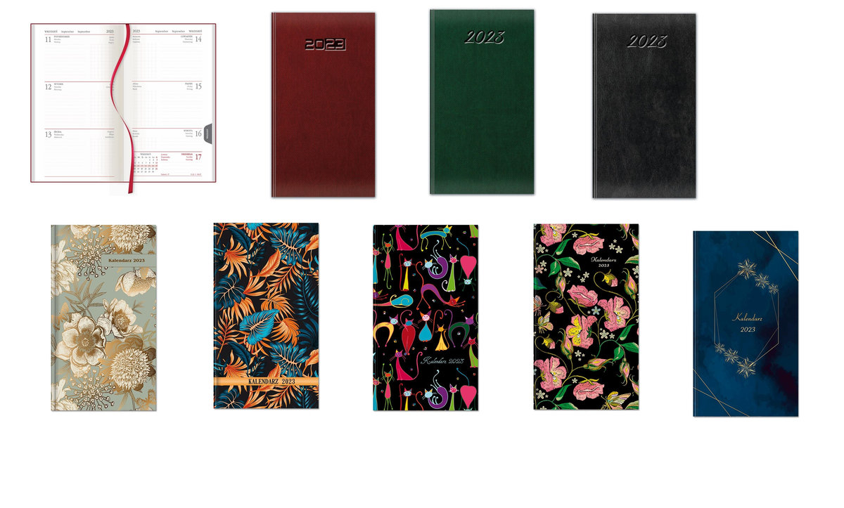Format - 9,5 x 17 cm, 144 strony /Układ - 1 tydzień na dwóch stronach po otwarciu /Druk, Papier - 2 kolory, papier 70g/m2 w kolorze chamois /Kalendarium - w języku polskim, angielskim, niemieckim, numeracja tygodni, wschody i zachody Słońca, potrójne imieniny /Oprawa - twarda, w trzech wersjach, zmiękczona gąbką, skóropodobna CAPRICE z eleganckim przeszyciem, rok tłoczony na gorąco z przebarwieniem, możliwość personalizacji oraz głębokiego tłoczenia logo firmy /Część informacyjna - plan roczny, miesięczny, telefony kierunkowe, skorowidz alfabetyczny, administracyjna i drogowa mapa Polski, mapki z odległościami drogowymi w Polsce i Europie, kalendarz stuletni, strefy czasowe, daty imienin i inne