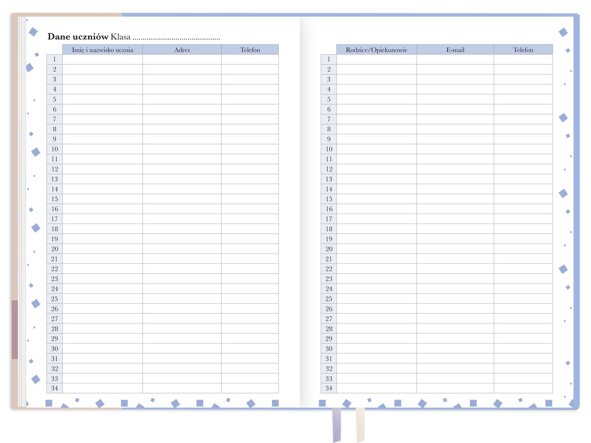 Jest trwały i poręczny. Zawiera tabele ocen, plan roku szkolnego, tabele dla nauczycieli i