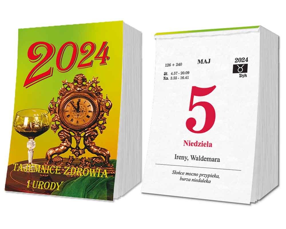 Układ: 1 dzień na stronie Kalendarium: w języku polskim, podwójne imieniny, wschody, zachody Słońca i Księżyca, fazy Księżyca, znaki zodiaku, numeracja dni, przysłowia Oprawa: klejona Część ...