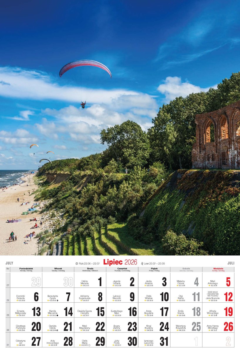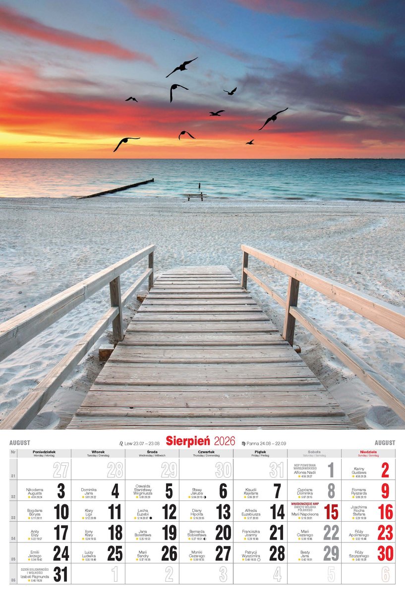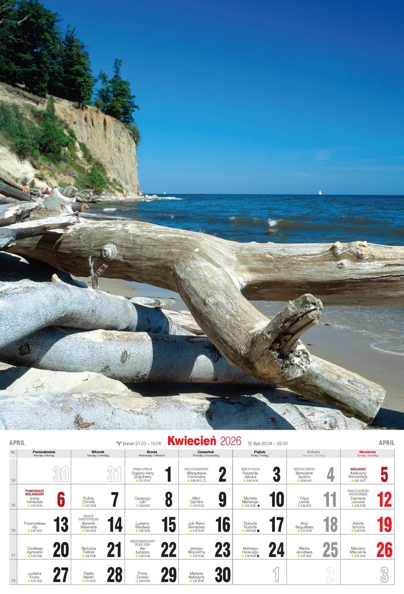 A3-12 Bałtyk Duży kalendarz ścienny, drukowany na grubym papierze powlekanym.Co zawiera kalendarz? - 12 miesięcznych plansz - najpopularniejsze imieniny, popularne święta - godziny wschodu