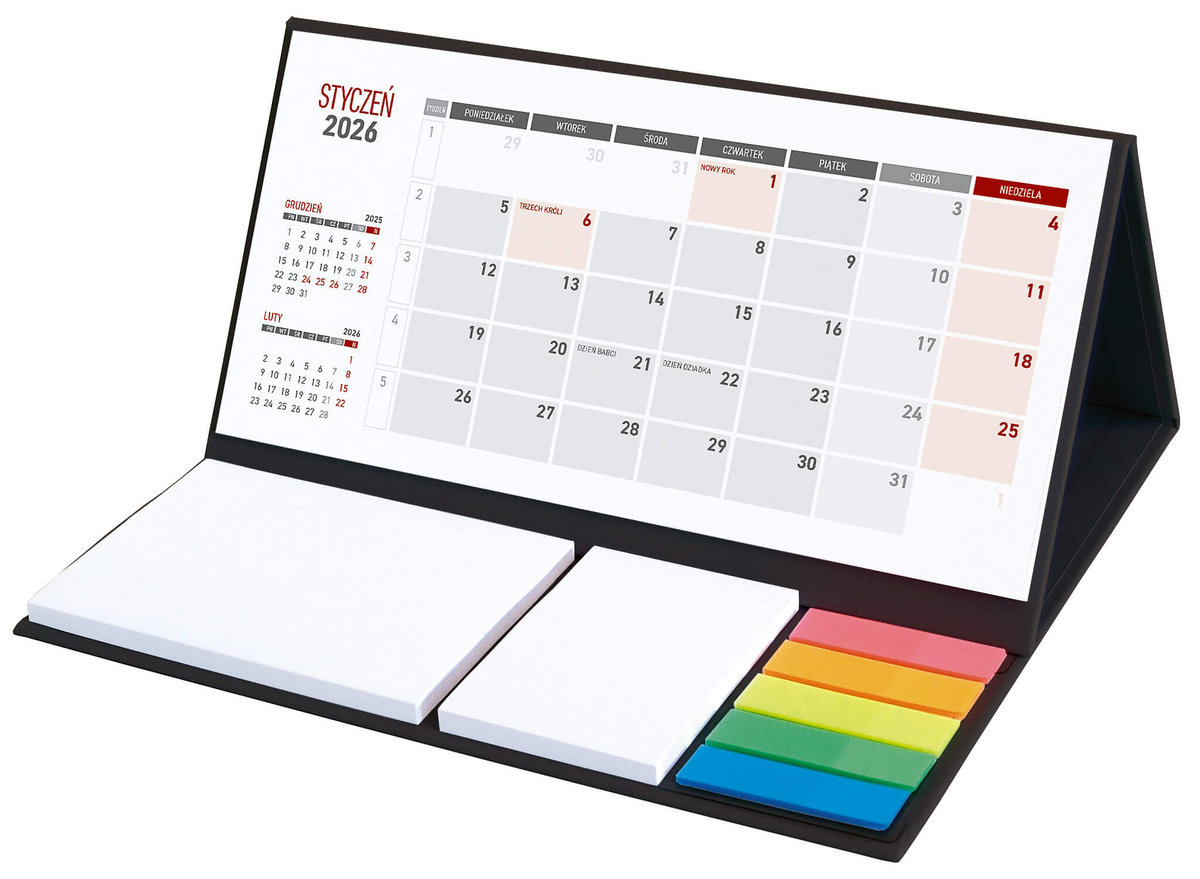 Kalendarz terminarz biurkowy z notesem 2026 czarny Praktyczny kalendarz stojący na biurko z przejrzystym kalendarium w układzie trzymiesięcznym. Poręczne samoprzylepne karteczki do notowania.W ...