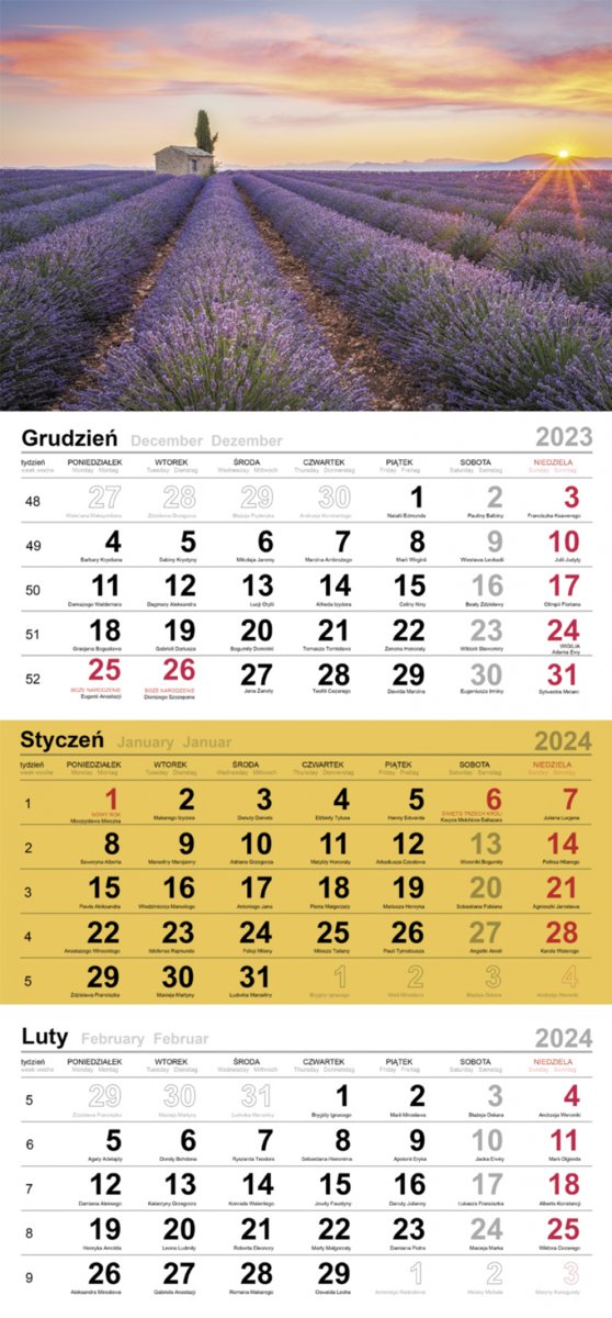 - format: 288 x 622 mm - układ kalendarium: 3 miesiące – 1 kartka - ilość stron: 12 kartek - druk: 2 kolory - rodzaj papieru: offset 80g/m2 biały - główka pełnokolorowa, okienko przesuwane, nazwy ...