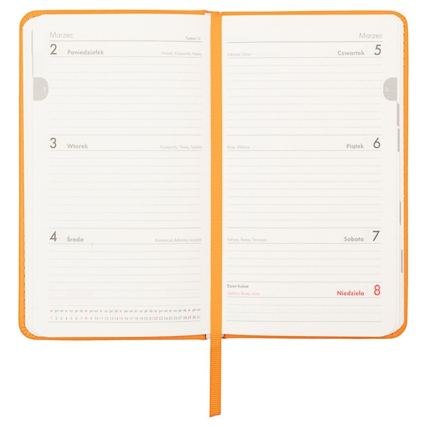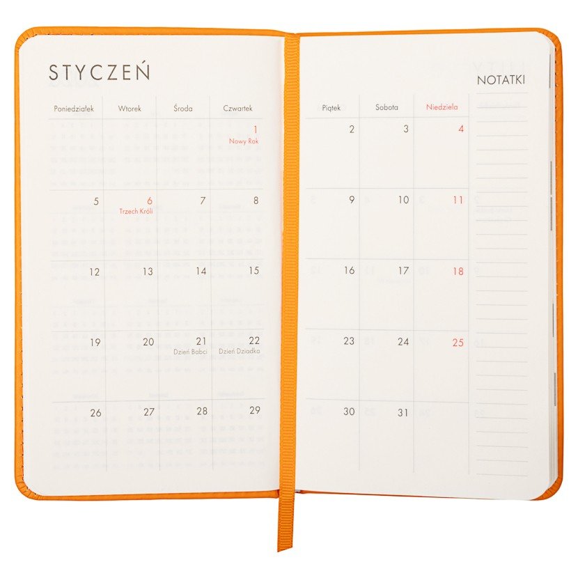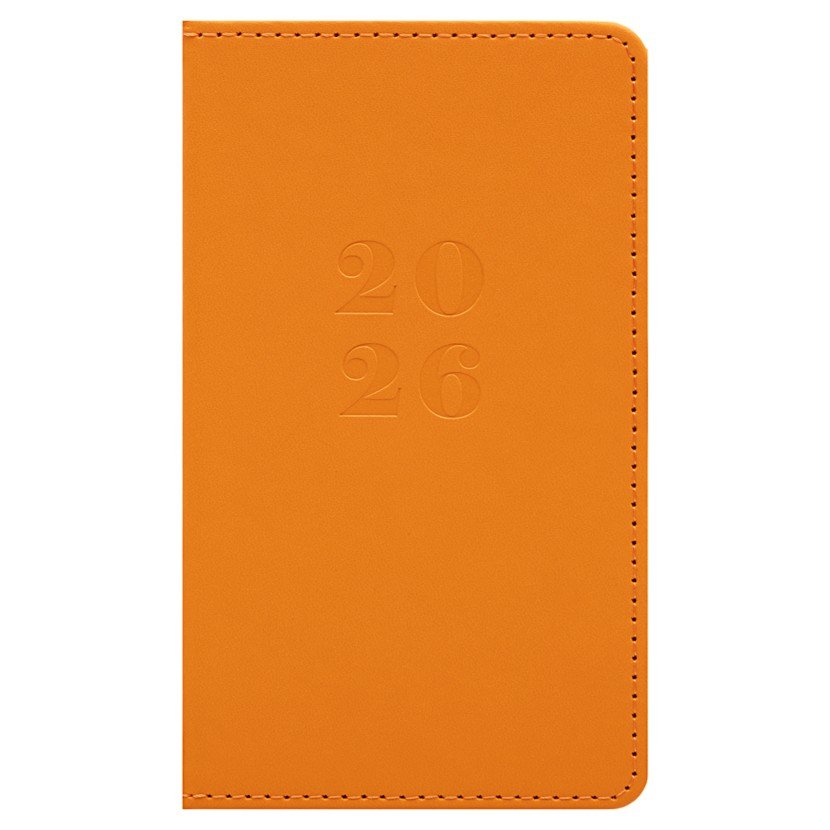 Twarda, pomarańczowa okładka nadaje kalendarzowi wyrazisty charakter i zapewnia trwałość, a prosty design sprawia, że jest czytelny i wygodny w użytkowaniu. Na szczycie kalendarza znajduje się wszyta pomarańczowa tasiemka, która umożliwia szybkie zaznaczanie i łatwe odnajdywanie stron. Format A6 (150 × 87 mm) sprawia, że kalendarz jest poręczny i można go wygodnie nosić w torbie, plecaku czy kieszeni.