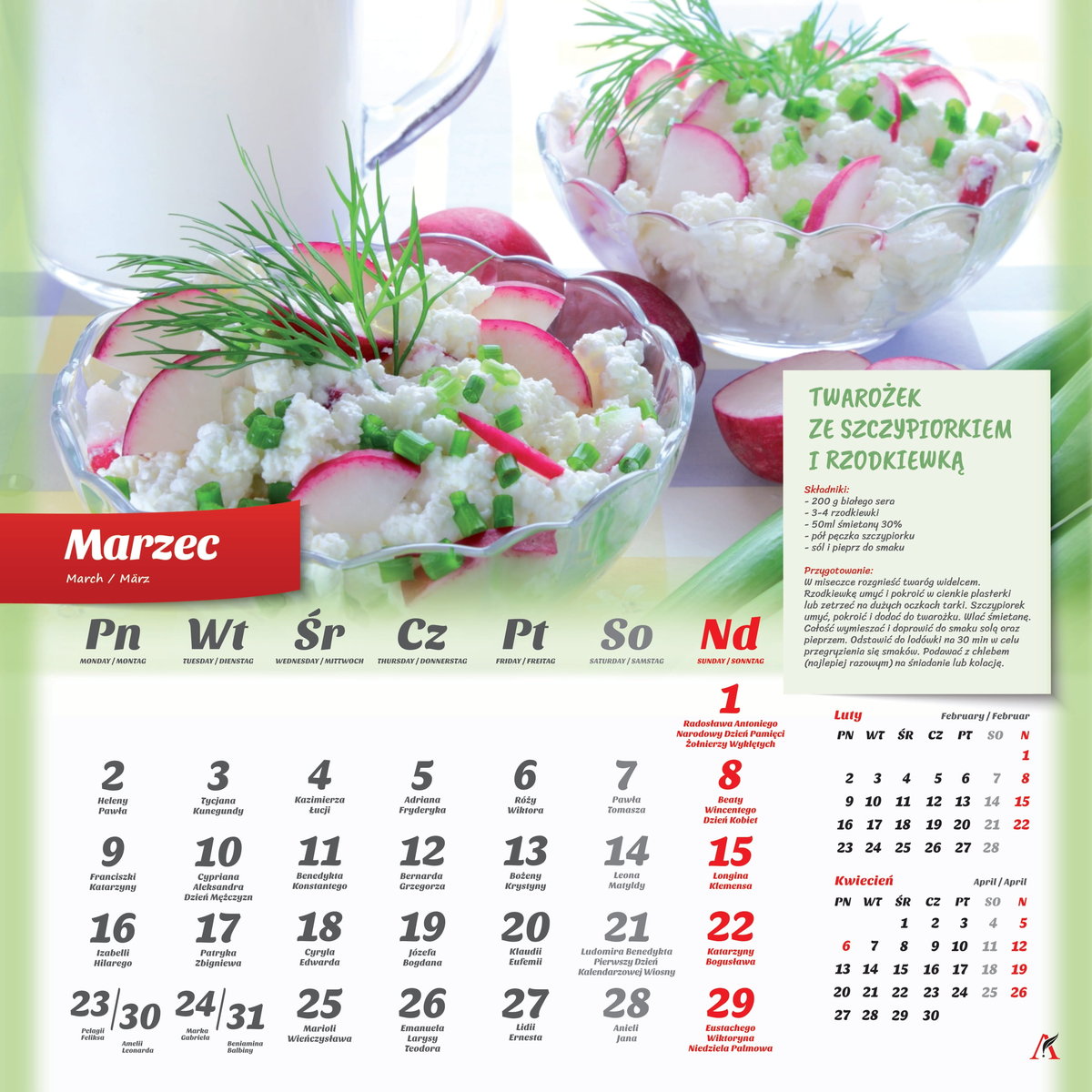 OKŁADKA: lakierowanaPLANSZE: 6ROZMIAR: 33x33 cmUKŁAD: miesięczny, zaznaczone imieniny, świętaDODATKI: na spirali z zawieszką
