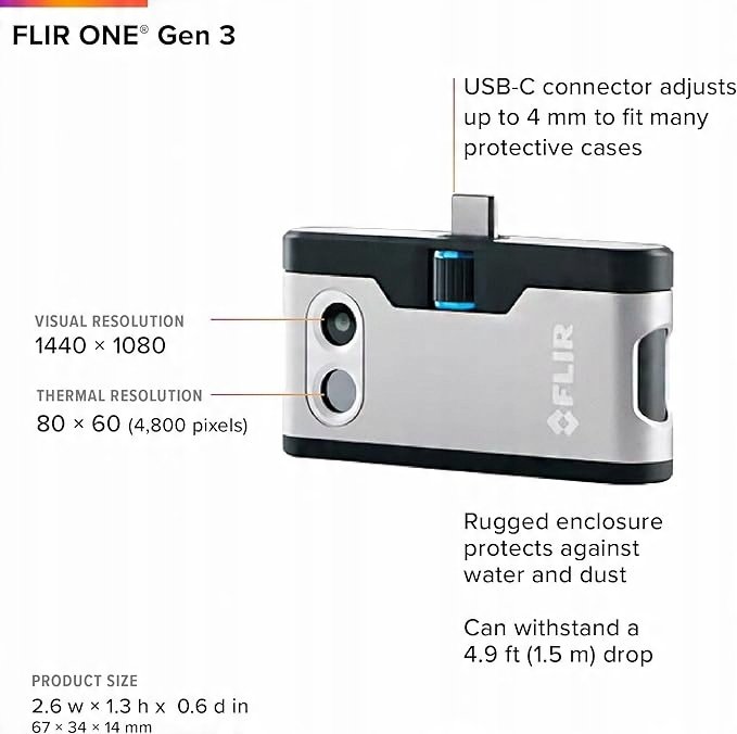 Zastosowanie: FLIR ONE to niezastąpione narzędzie dla techników, elektryków, monterów oraz wszystkich, którzy potrzebują przenośnej i dokładnej kamery termowizyjnej. Świetnie sprawdza się w diagnostyce budynków, sprawdzaniu szczelności instalacji oraz naprawach elektronicznych, zapewniając szybki i precyzyjny pomiar ciepła.