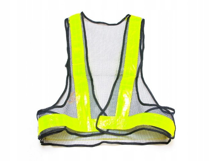 Przedmiotem aukcji jest siatkowana kamizelka ostrzegawcza z fluorescencyjnymi taśmami odblaskowymi.