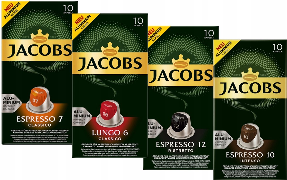Nowe aluminiowe kapsułki Jacobs są przeznaczone do ekspresów Nespresso®*, za wyjątkiem U®*, Umilk®*, Expert®*, Expert&Milk®*, Prodigio®* oraz Prodigio&Milk®* zakupionych po 25 lipca 2016. Nie są kompatybilne z ekspresami z linii Professional oraz Vertuo.