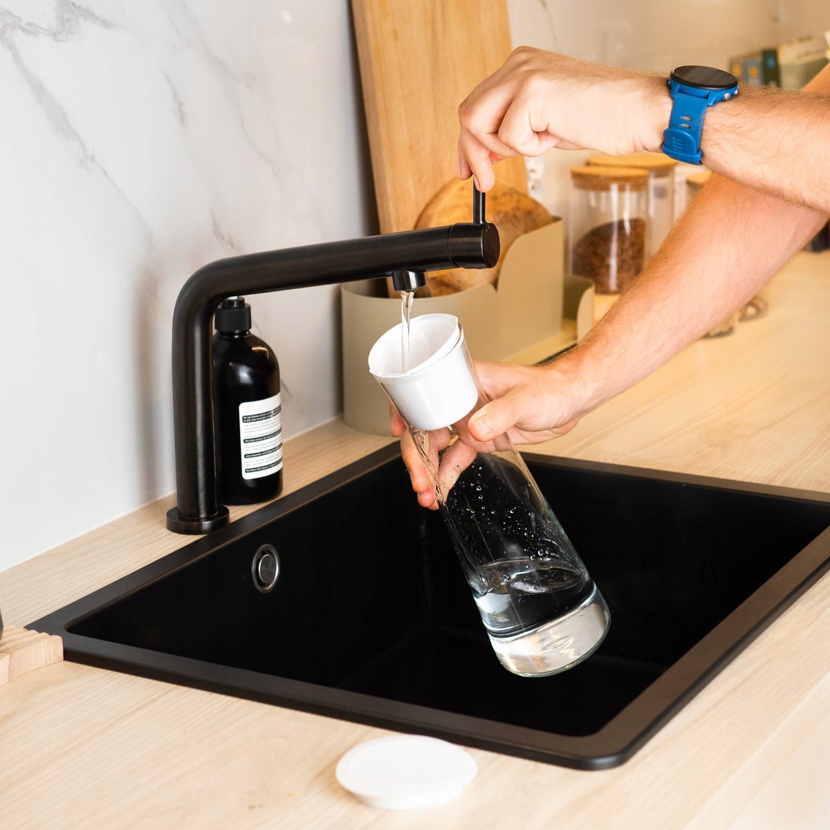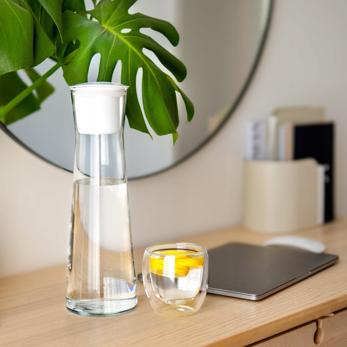 Dzięki przechowywaniu wody w szkle zamiast w plastiku, przefiltrowana woda pozostaje wolna od mikroplastiku, zachowując swój naturalny smak.