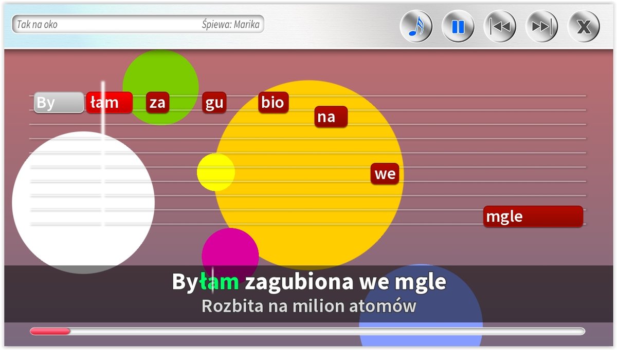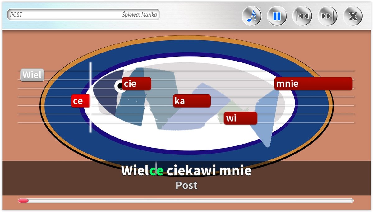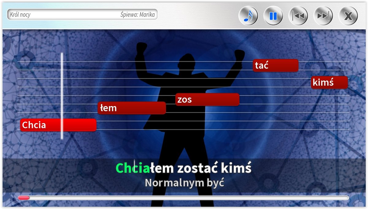 - Różne rodzaje podpowiedzi na ekranie, w tym: tekst piosenki, belki z tekstem, pasek czasu.