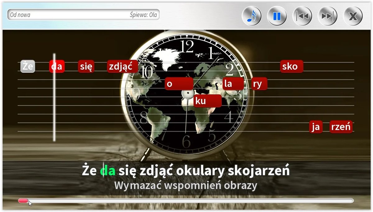 - Różne rodzaje podpowiedzi na ekranie, w tym: tekst piosenki, belki z tekstem, pasek czasu.