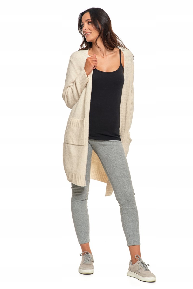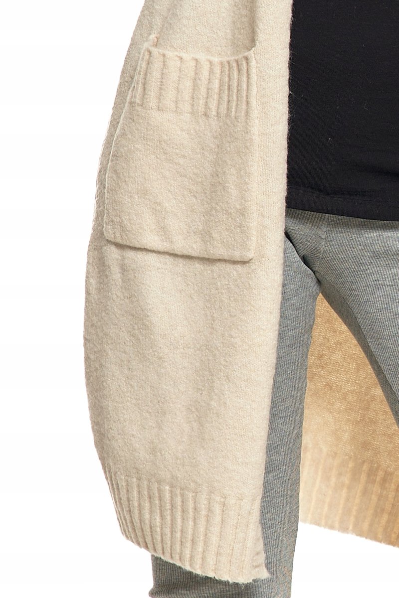 Dodatkowym atutem tego modelu są szerokie, praktyczne kieszenie umieszczone z przodu, które nie tylko dodają mu uroku, ale także podnoszą funkcjonalność. Dzięki swojej długości, kardigan zapewnia dodatkową ochronę przed chłodem, co czyni go idealnym wyborem na sezon jesienno-zimowy. Całość swetra charakteryzuje się minimalistycznym, a zarazem nowoczesnym designem, który podkreśla jego wszechstronność.