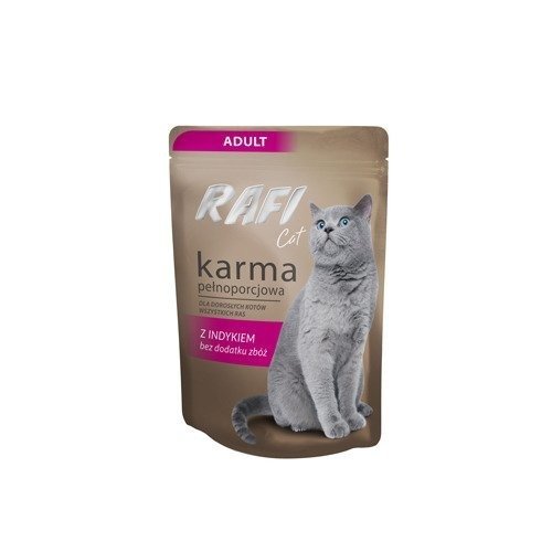 Karmy Rafi Cat to pełnoporcjowe karmy dla dorosłych kotów. Odpowiednio skomponowany skład spełnia wszystkie specyficzne wymagania żywieniowe kotów dorosłych. Najważniejszymi walorami karm są podstawowe surowce: mięso i produkty pochodzenia zwierzęcego, które są źródłem białka wysokiej jakości. Karmy są produktami o optymalnej ilości tłuszczu, wysokiej zawartości naturalnie występującego w mięsie i produktach pochodzenia zwierzęcego kwasu arachidonowego – niezbędnego do prawidłowego funkcjonowania organizmu kota. Dodatkowo mięso i produkty pochodzenia zwierzęcego, olej lniany, olej z łososia, bilansują dietę kota w wielonienasycone kwasy tłuszczowe, zarówno te z rodziny n-3 i n-6. Dodatek do karm tauryny spełnia niezbędny wymóg pokrywając zapotrzebowanie kota na ten aminokwas, dzięki czemu proces trawienia tłuszczy i białek zachodzi w sposób prawidłowy. Odpowiedni stosunek wapnia do fosforu przyczynia się do utrzymania prawidłowej homeostazy tych pierwiastków w organizmie i utrzymanie mineralizacji kości na stałym poziomie. Obecność jodu zapewnia prawidłowy przebieg procesów metabolicznych wszystkich składników odżywczych.