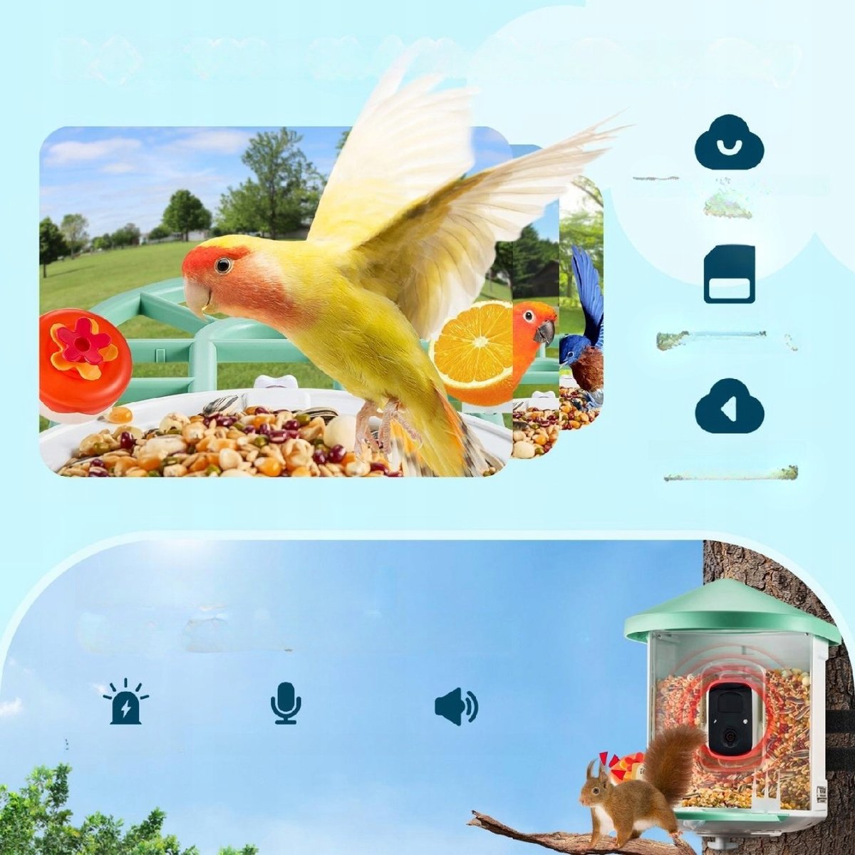 Nie martw się o wiewiórki kradnące pokarm dla ptaków! Inteligentny karmnik AI jest wyposażony w alarm dźwiękowy i dwukierunkowy system audio, dzięki czemu możesz słuchać odgłosów ptaków, „rozmawiać” z nimi i odstraszać natrętne wiewiórki, zapewniając bezpieczeństwo karmnika i ochronę pokarmu.