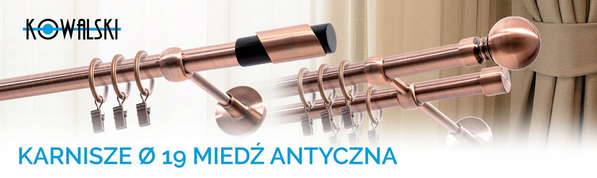 Karnisz o średnicy 19 mm z kółkamiKarnisze w kolorze miedzi antycznej są nowością w naszej ofercie, a już zyskały na popularności. Głównie dlatego, iż idealnie wpisują się w klimat bardzo modnych ...