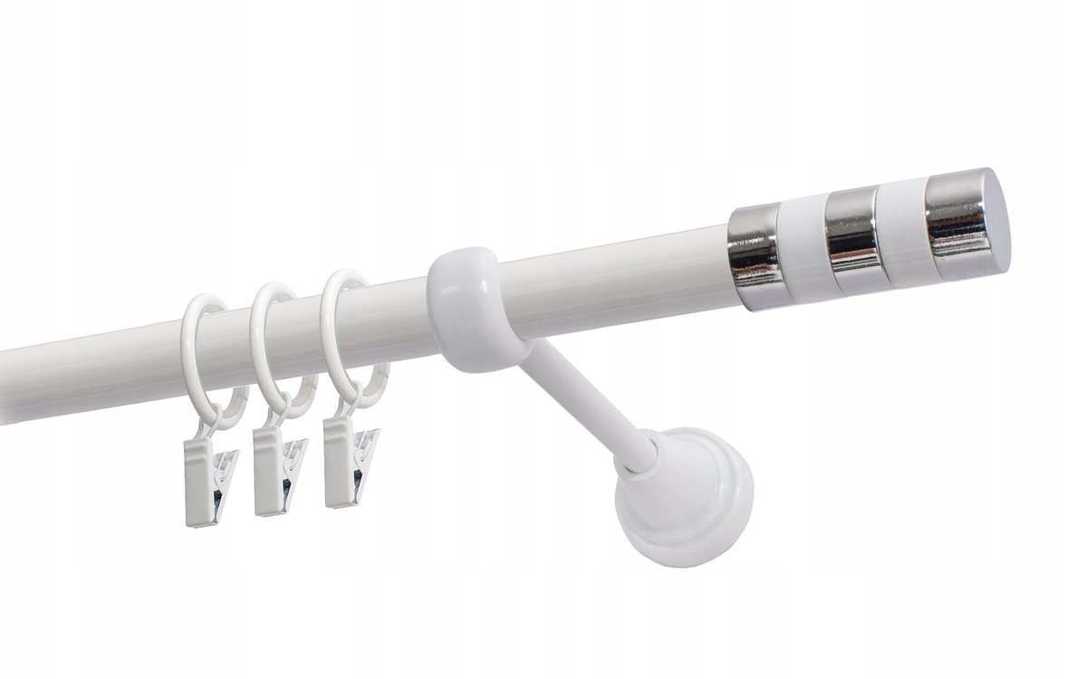 Karnisz o średnicy 19 mm z kółkami. Pojedynczy karnisz doskonale prezentuje się we wnętrzach mieszkalnych. Można go zamontować wszędzie tam, gdzie chce się powiesić firany lub zasłony za pomocą żabek