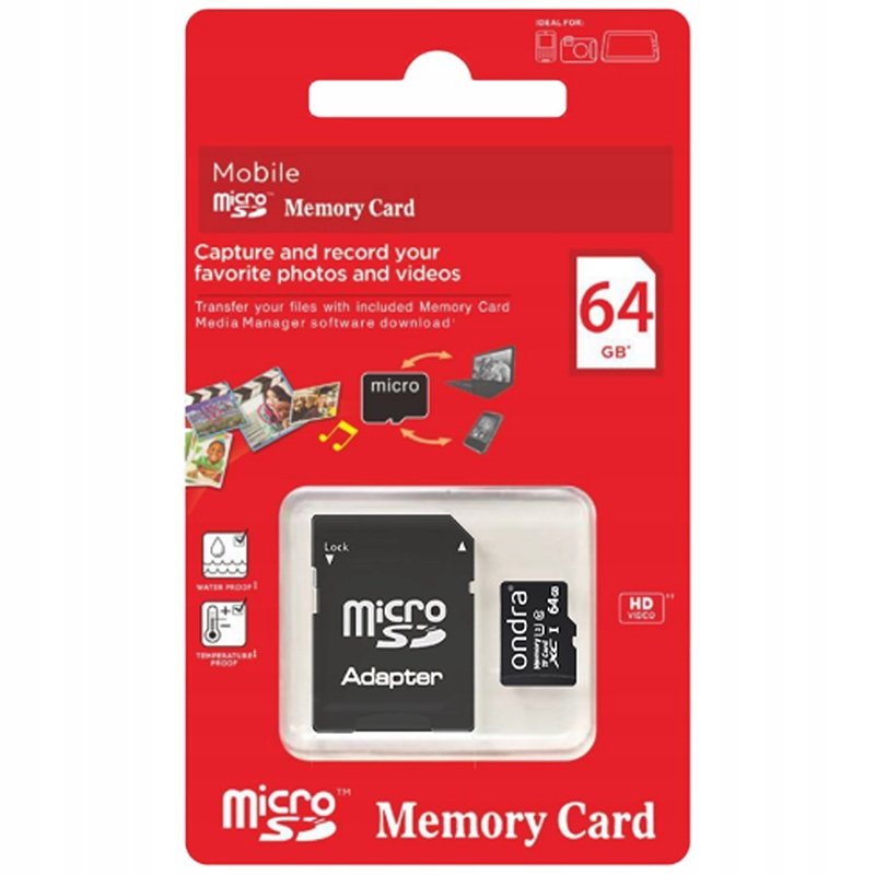 KARTA PAMIĘCI ONDRA 64GB ADAPTER DO WIDEOREJESTRATORÓW APARATÓW DRONÓW KLASA 10 U3 - JEDNA KARTA WIELE MOŻLIWOŚCI