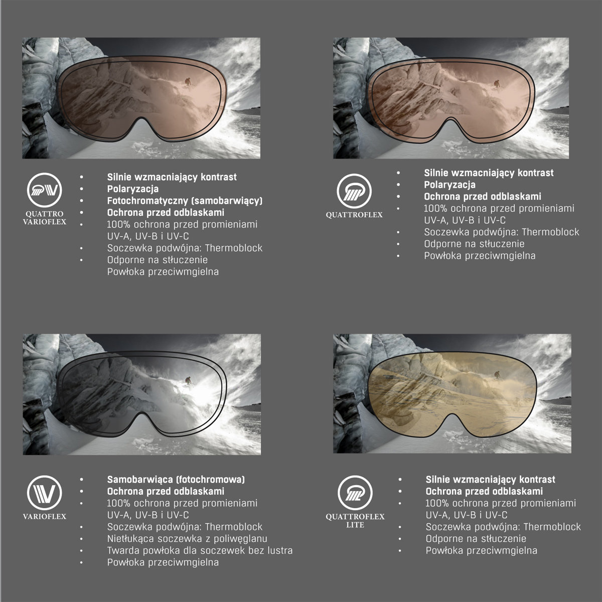 - Varioflex - Technologia Varioflex sprawia, że soczewka fotochromatyczna automatycznie reaguje na światło widzialne i ciemnieje w ciągu kilku sekund lub rozjaśnia się, gdy robi się ciemniej.