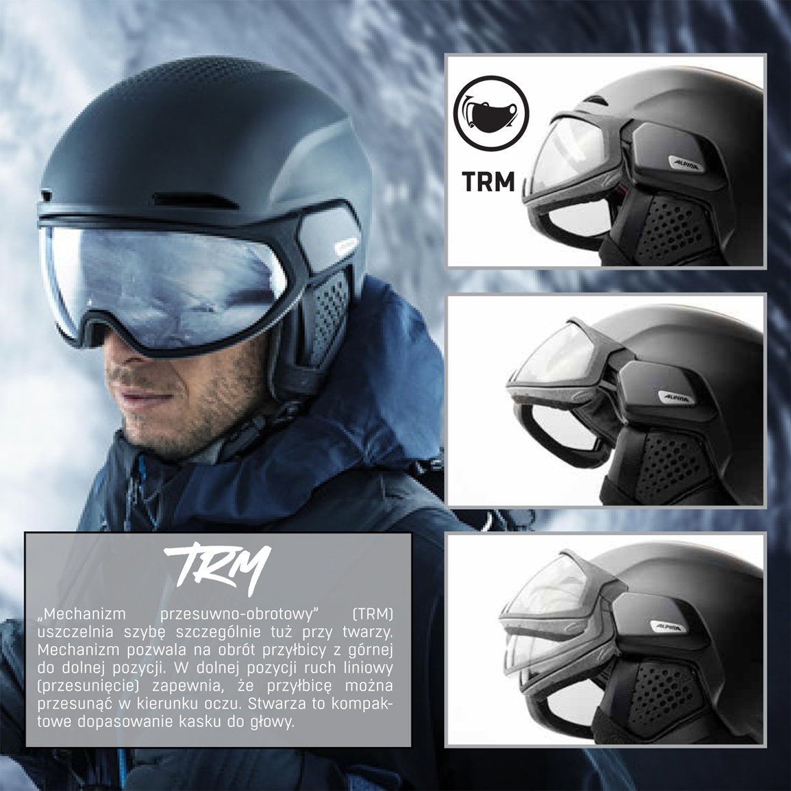 Styl, estetyka, innowacja. ALPINA ALTO V to kask z przyłbicą pozwala każdemu pokazać się z jak najllepszej strony. Perfekcyjny mechanizm TRM wyznacza nowe standardy pod względem komfortu.