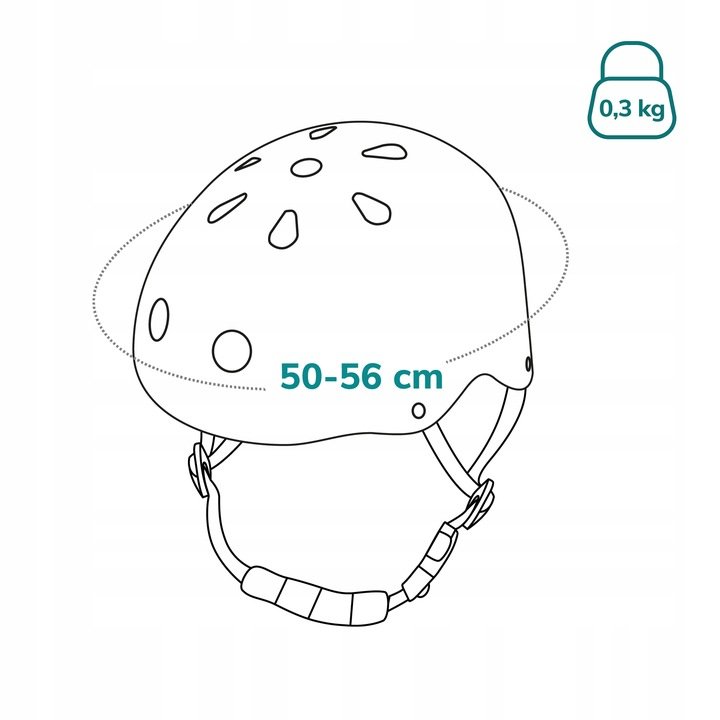 - Dzięki dużemu zakresowi regulacji kask można dopasować do dzieci w różnym wieku – zakres obwodu głowy to ok. 50-56 cm.