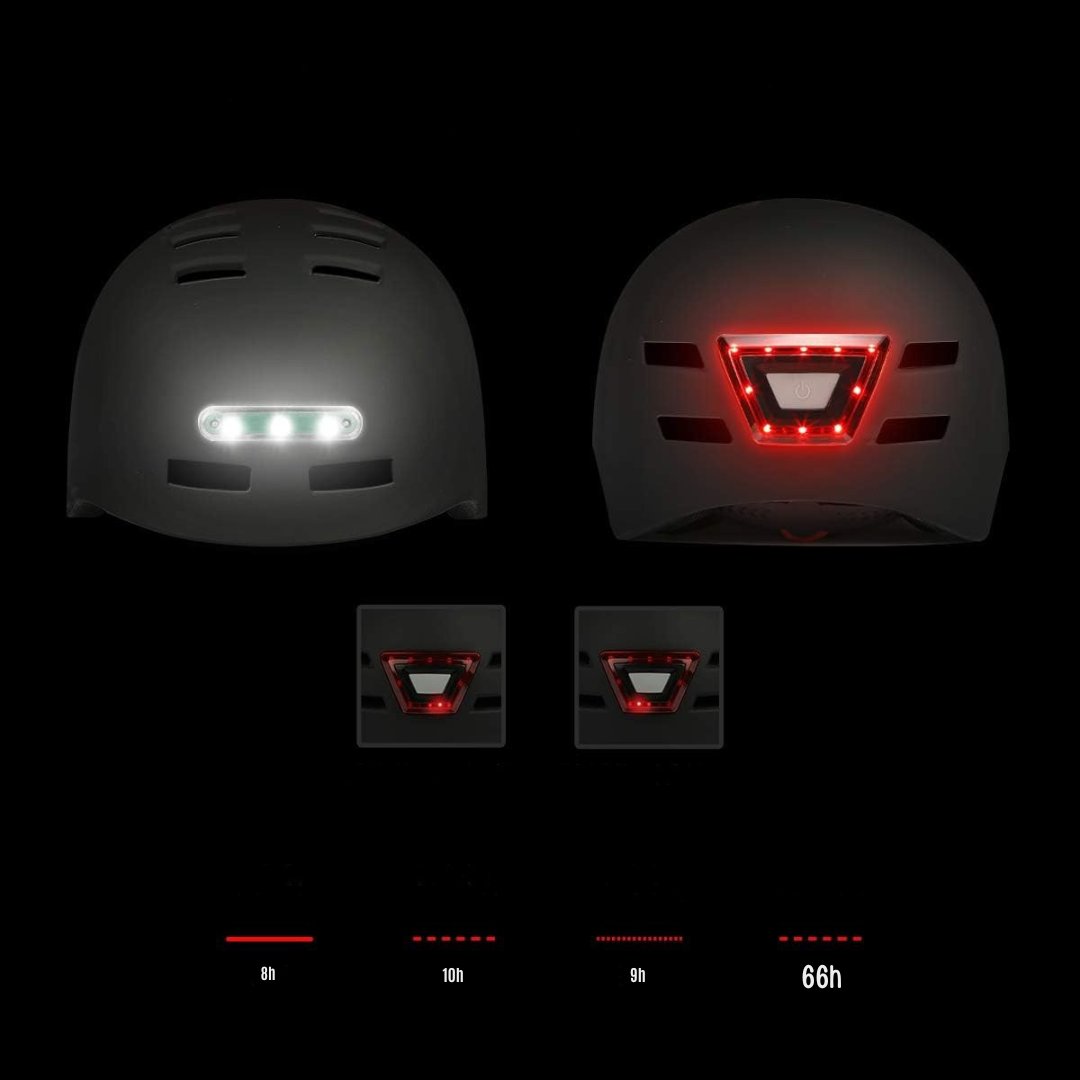 - Zintegrowany reflektor i światło tylne: kask wyposażony w zintegrowany reflektor z trzema białymi diodami LED z przodu oraz dziesięcioma czerwonymi diodami LED z tyłu. Dzięki temu zwiększa widoczność użytkownika dla kierowców, pieszych oraz innych rowerzystów, co pozwala na wcześniejsze zauważenie i wskazanie kierunku jazdy. Takie rozwiązanie znacząco podnosi bezpieczeństwo podczas nocnej jazdy.