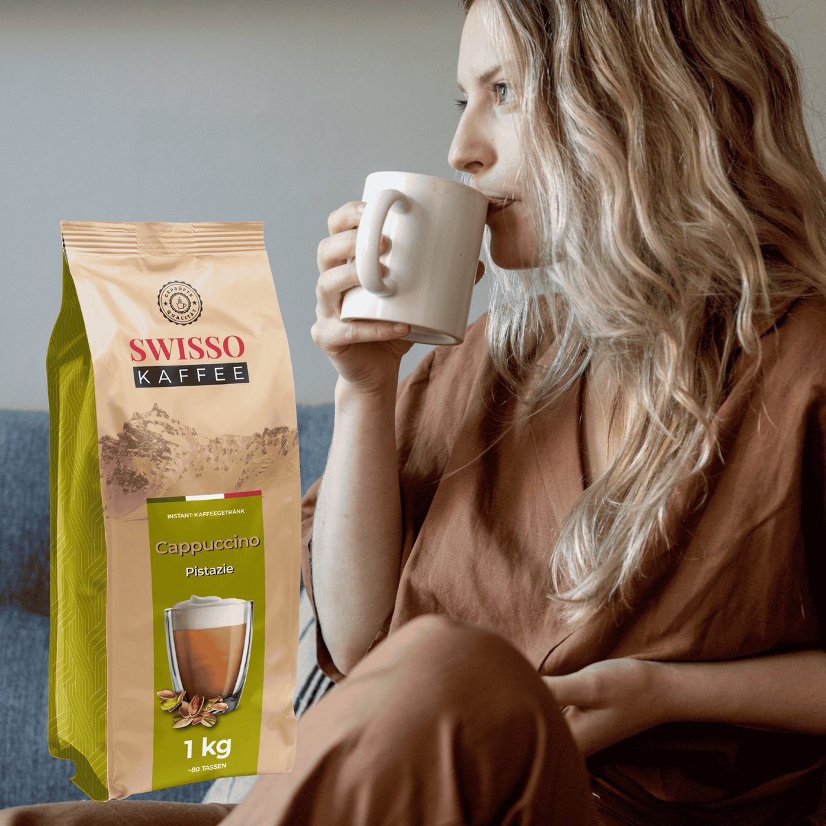 Swisso Kaffee Cappuccino pistacjowe 1 kg – kremowy, rozpuszczalny napój o pistacjowym aromacie, idealny na każdą chwilę relaksu, WYSOKA JAKOŚĆ