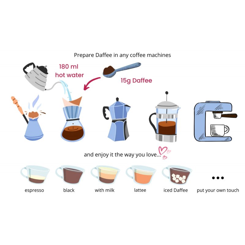 Zaparzanie Daffee jest bezwysiłkowe — po prostu wymieszaj 15 g z 180 ml wody ulubioną metodą, czy to w ekspresie przelewowym, kawiarce Moka czy zaparzaczu tłokowym. W ciągu zaledwie dwóch minut delektuj się filiżanką, która odżywi zarówno ciało, jak i duszę.