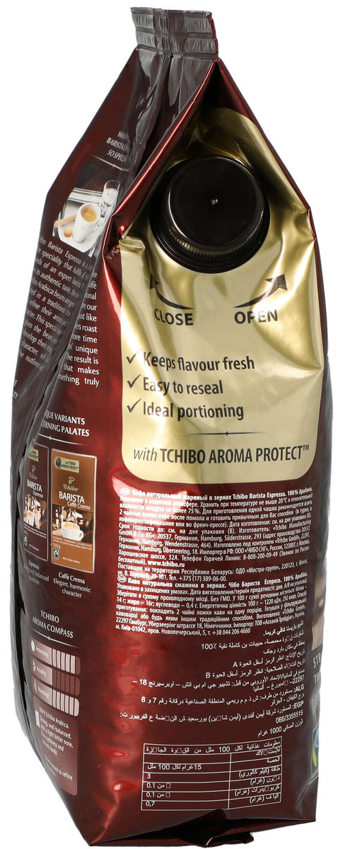 Espresso Barista składa się w 100% z ziaren Tchibo Arabica. Jest to najlepszy gatunek kawy, który wyróżnia się wyrazistym smakiem oraz brakiem kwasowości. Tradycyjne, znane od dziesięcioleci metody palenia pozwalają wydobyć z kawy pełnię aromatu. Polegają one na powolnym obracaniu ziaren na bębnowych maszynach prażalniczych.
