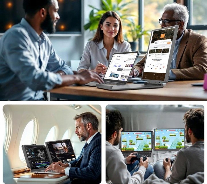 - Uniwersalna kompatybilność: monitor podróżny 16:10 do laptopów płynnie rozszerza laptopy o przekątnej 33-16,5" (33-42 cm) (Mac/Windows/Android). Można go używać jako stałego drugiego wyświetlacza lub jako samodzielnego wyświetlacza. Proste złącze Plug and Play przez HDMI/USB-C/USB-A (nie wymaga sterowników). Wbudowane głośniki + Dex, PS5, obsługa przełącznika. Mały ekran