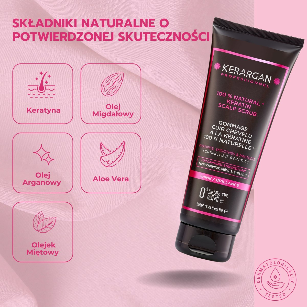 Rewitalizuj swoją skórę głowy z peelingiem do włosów Kerargan Usuń zanieczyszczenia i resztki, jednocześnie wzbogacając skórę głowy w keratynę. Zdrowa podstawa dla błyszczących włosów!