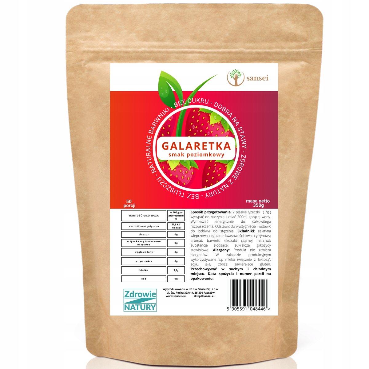 KETO Galaretka bez cukru i węglowodanów POZIOMKA 350g to aż 50 porcji! Składniki naturalnego pochodzenia Ciesz się smakiem poziomek bez zbędnych dodatków cukru z Sansei Galaretką BEZ CUKRU. Ten