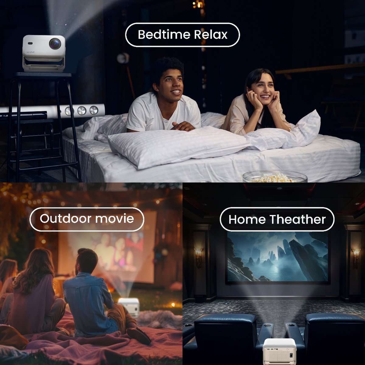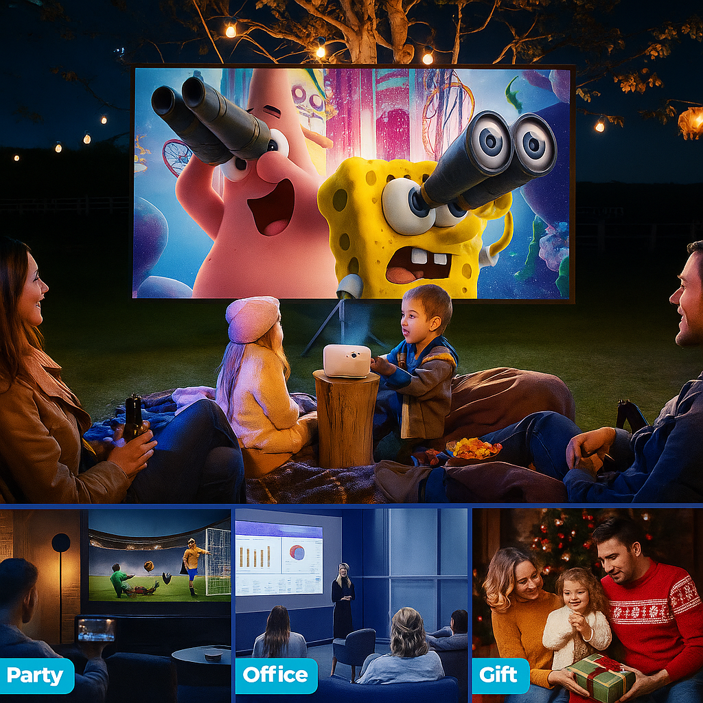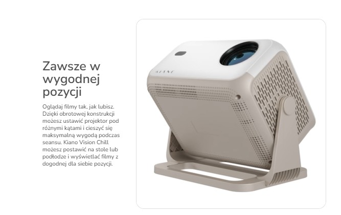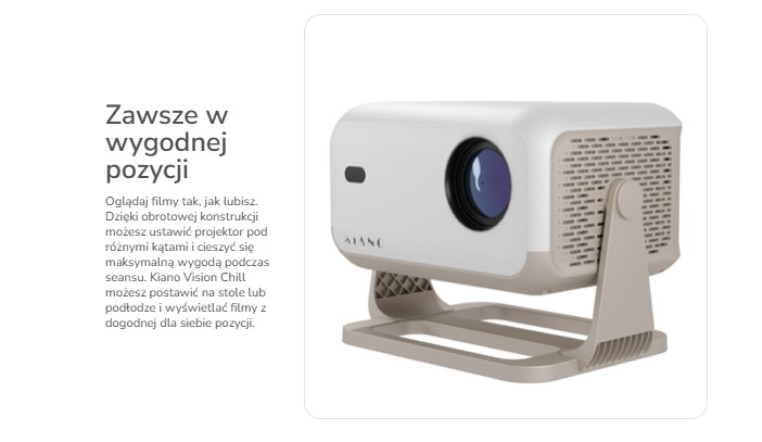 Projektor Kiano Chill został zaprojektowany z myślą o maksymalnej wygodzie użytkowania – dzięki zintegrowanej, regulowanej podstawie, możesz łatwo ustawić urządzenie pod kątem do 90°, kierując obraz na ścianę lub sufit – idealnie do wieczornego seansu w łóżku czy spontanicznego pokazu w salonie.