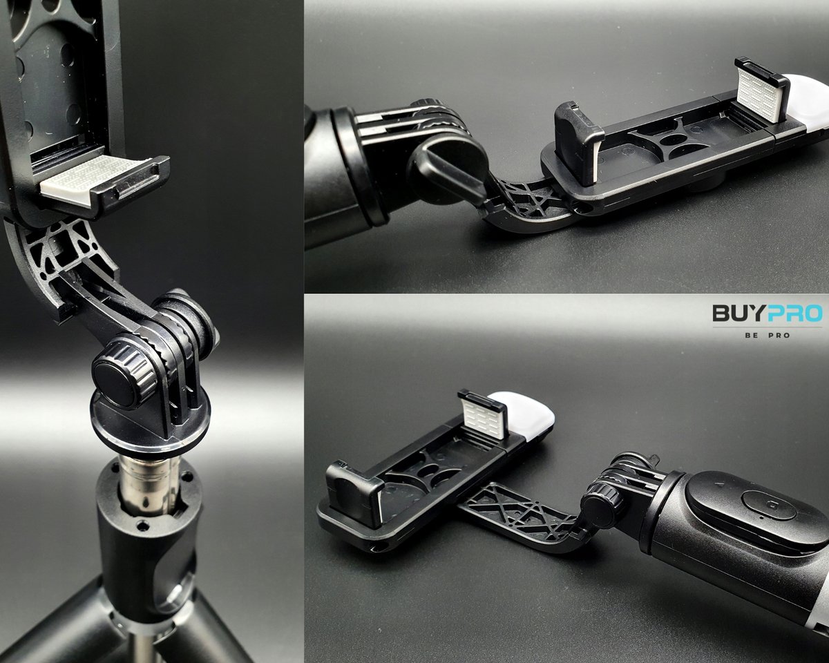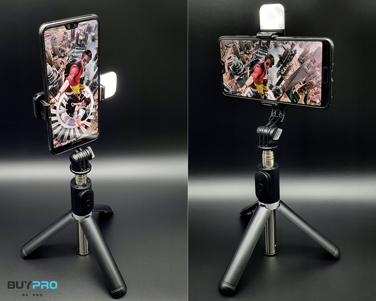Urządzenie może pełnić również rolę tripodu (statywu), który jest niezastąpiony zarówno przy video rozmowach jak i wykonywaniu zdjęć zdalnie, przy użyciu załączonego w zestawie pilota. Bardzo ciekawą możliwością jest rozłożenie nóżek, idealnie sprawdzi się podczas wideorozmów na Skype, FaceTime czy każdej innej platformie z jakie korzystacie. Uchwyt jest stabilny nie ma zagrożenia, że się przewróci.