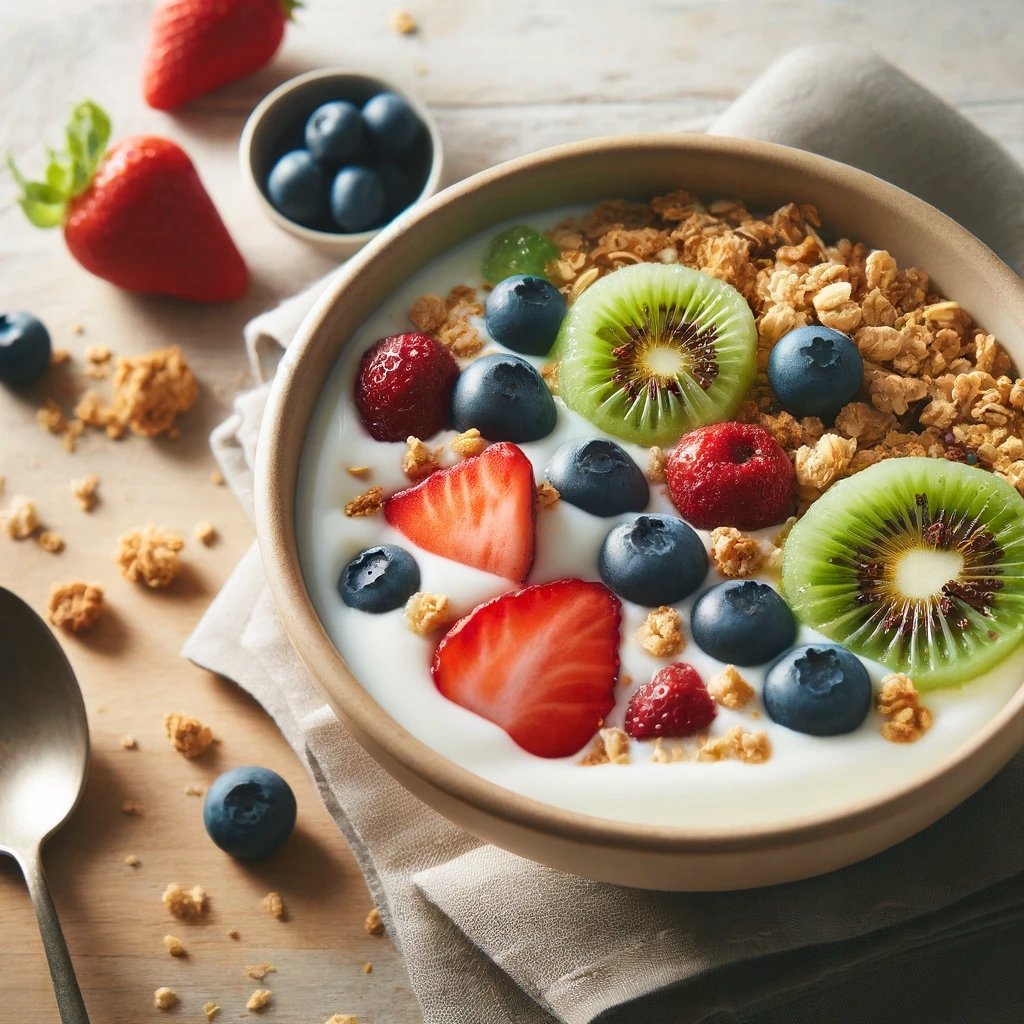 Podawaj natychmiast, aby granola pozostała chrupiąca, a owoce świeże.