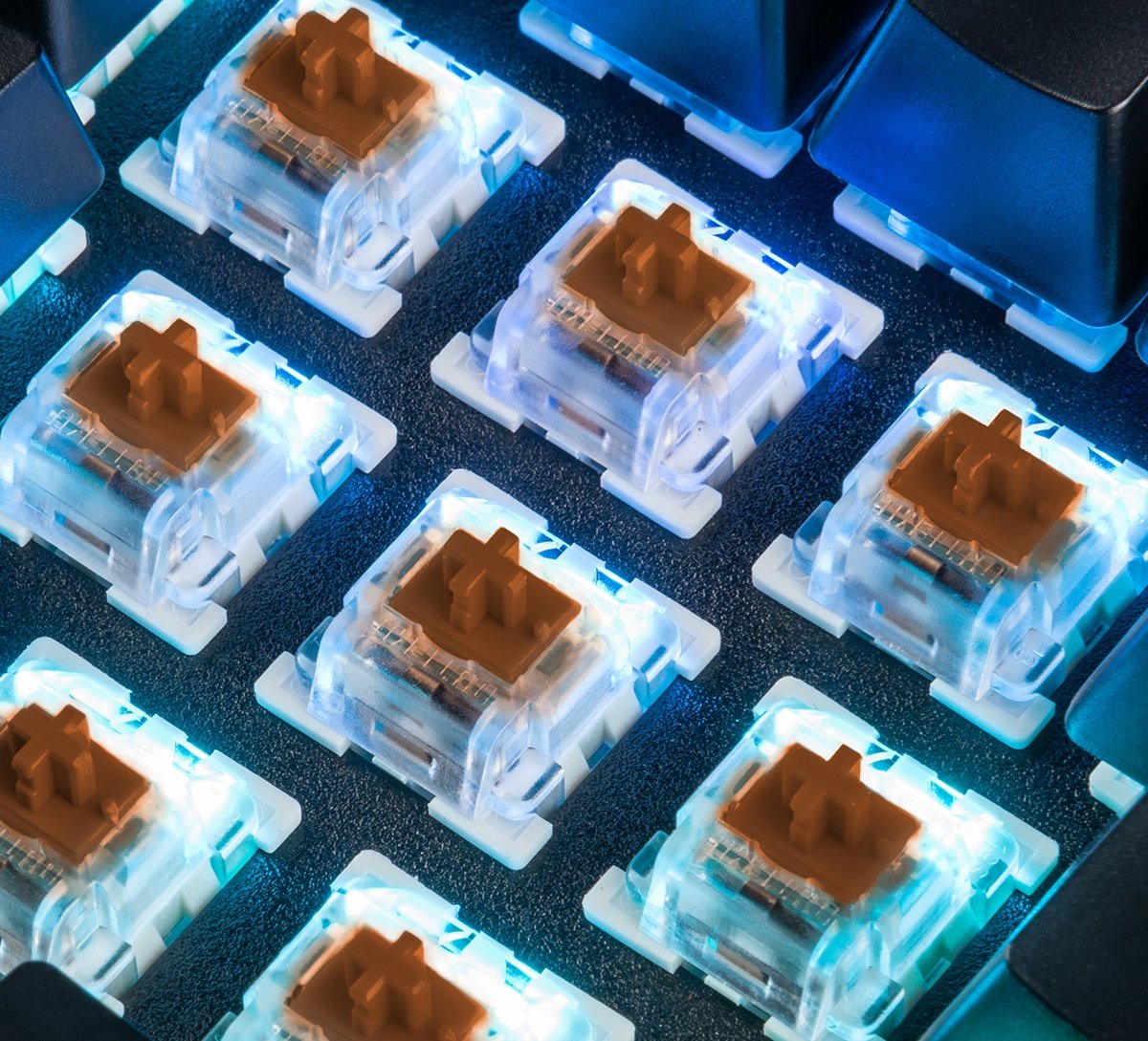 Przełączniki z wyczuwalnym momentem przeskoku, jednak bez głośnego kliku towarzyszącemu przełącznikom niebieskim.