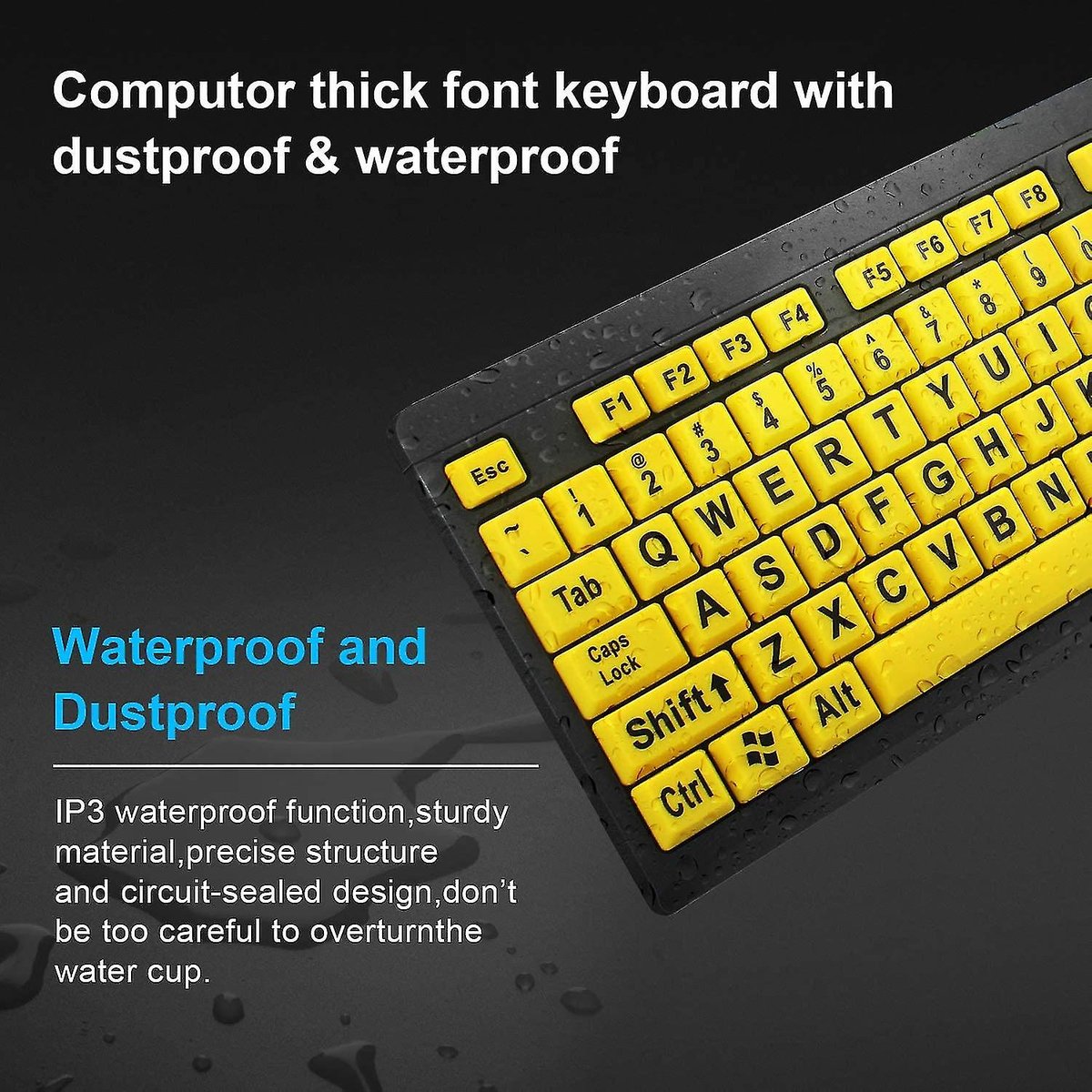 Klawiatura z dużym nadrukiem, większymi niż zwykle literami i klawiszami Command w większej, pogrubionej czcionce, te klawisze o wysokim kontraście z pewnością pomogą osobom z problemami z widzeniem. Idealna dla osób starszych, niedowidzących, szkół, oddziałów specjalnych i bibliotek, a także firm. ^Klawiatura odporna na zalanie. Została zaprojektowana, aby chronić elektroniczne elementy klawiatury. Wodoodporna funkcja ochrony przed przypadkowym zalaniem zapewnia dodatkowy spokój ducha. Po zalaniu należy dokładnie wysuszyć klawiaturę na powietrzu przed ponownym użyciem. ^Klawiatura z dużym nadrukiem o wysokim kontraście zapewnia lepszą widoczność dzięki wyraźnym żółtym nakładkom klawiszy i dużym, czarnym literom, które są dobrze widoczne nawet przy słabym oświetleniu. Dzięki żywotności 5 milionów naciśnięć klawiszy, przełączniki membranowe zapewniają szybszą reakcję i cichsze pisanie. ^Ergonomiczna konstrukcja. Rozłóż nóżki z tyłu klawiatury, aby zmniejszyć zmęczenie dłoni i cieszyć się długimi godzinami gry. Pełny układ klawiatury (USA) ze 104 klawiszami i blokiem numerycznym oraz dużymi literami zapewnia wyjątkowy komfort bez konieczności ponownej nauki pisania.