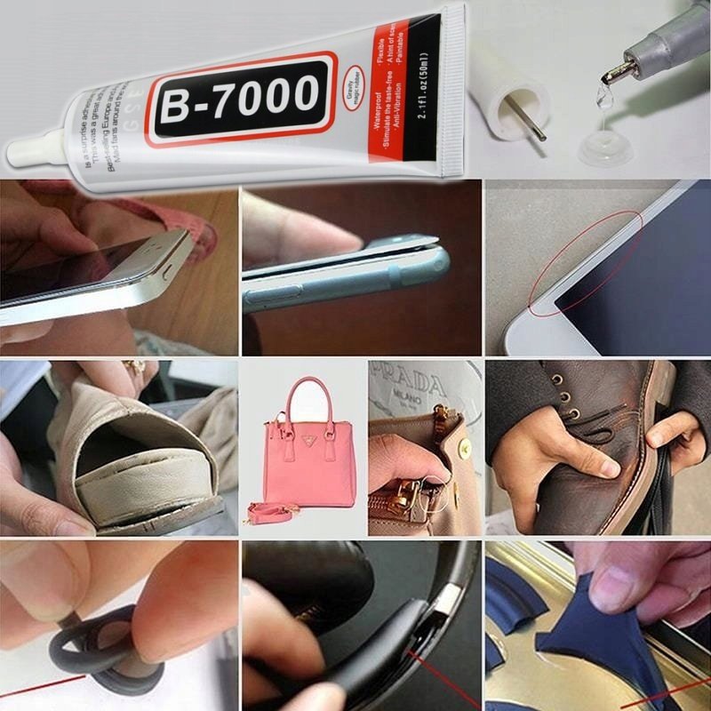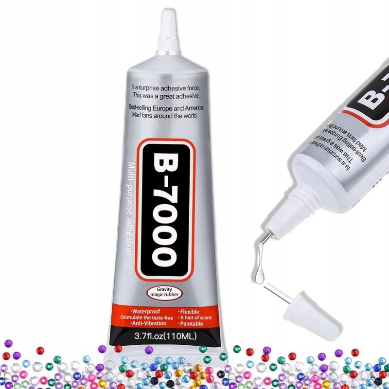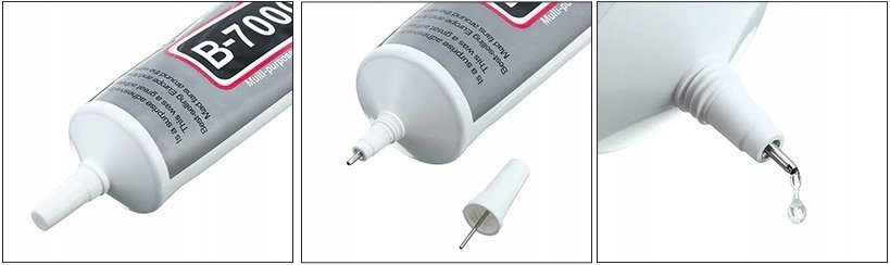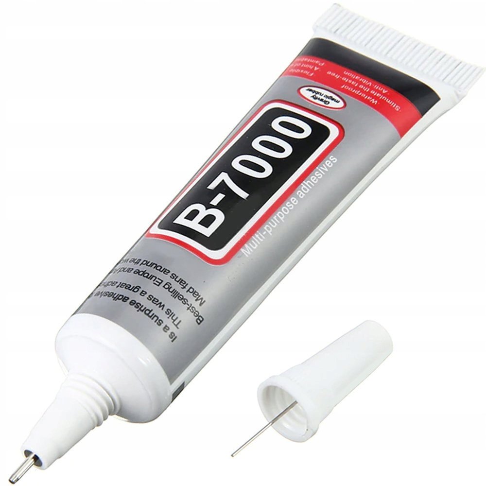 Klej B-7000 z właściwościami uszczelniającymi. Jego właściwości fizyczne i chemiczne sprawiają, że jest niezastąpiony w montażu wyświetlaczy, paneli dotykowych, korpusów czy szybek w smartfonach i tabletach. Po wyschnięciu tworzy elastyczne a zarazem silne spoiwo. Doskonale sprawdza się w zastępstwie taśm montażowych.