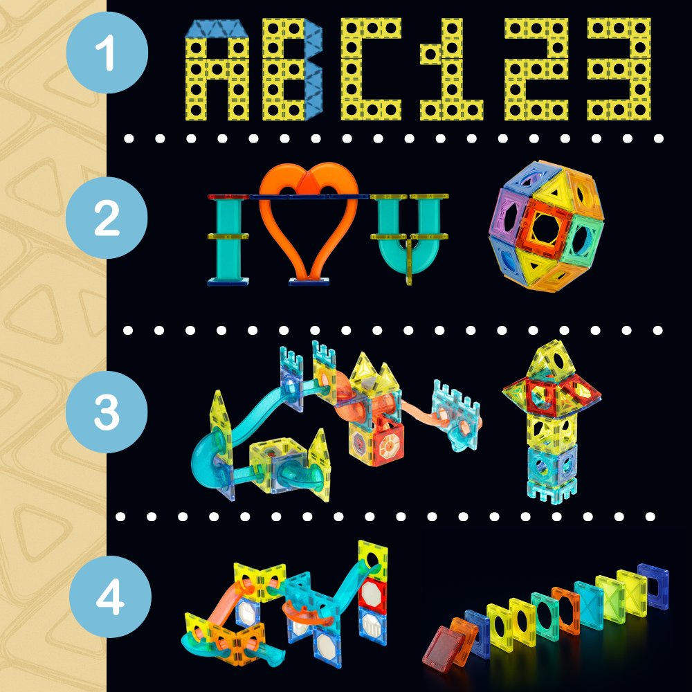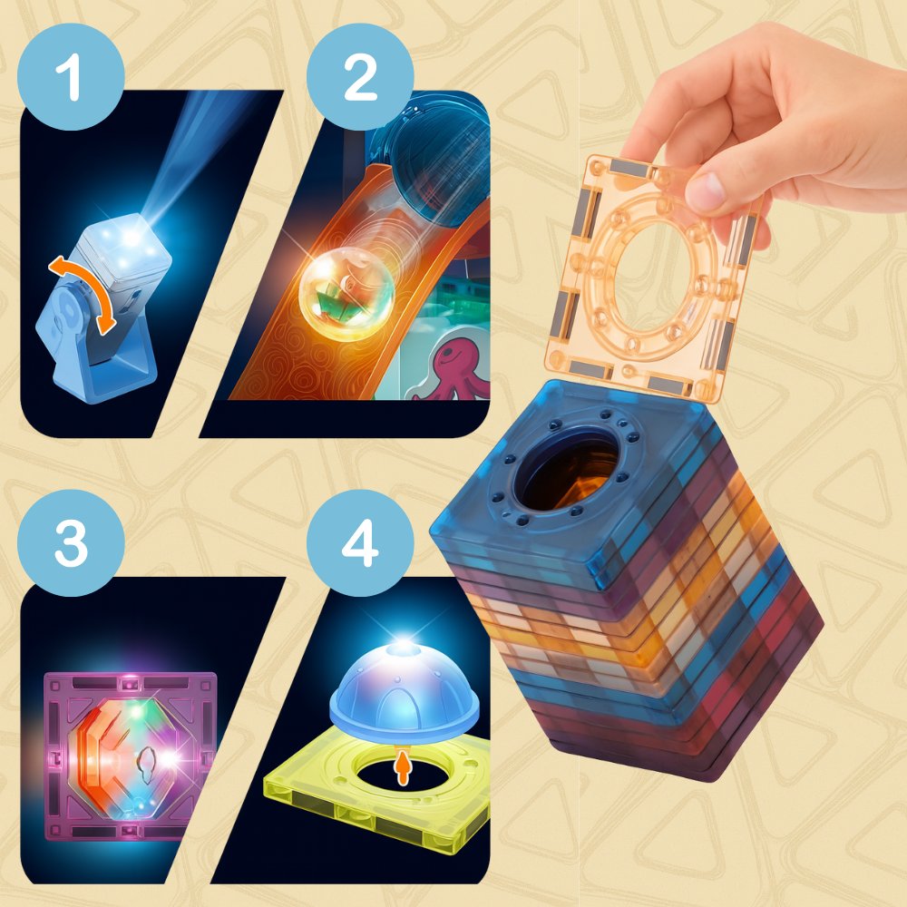 Zestaw składa się z aż 110 elementów, w tym magnetycznych części, które umożliwiają tworzenie stabilnych i efektownych konstrukcji, zachęcając do ciągłego odkrywania nowych kombinacji i zabawy bez końca.