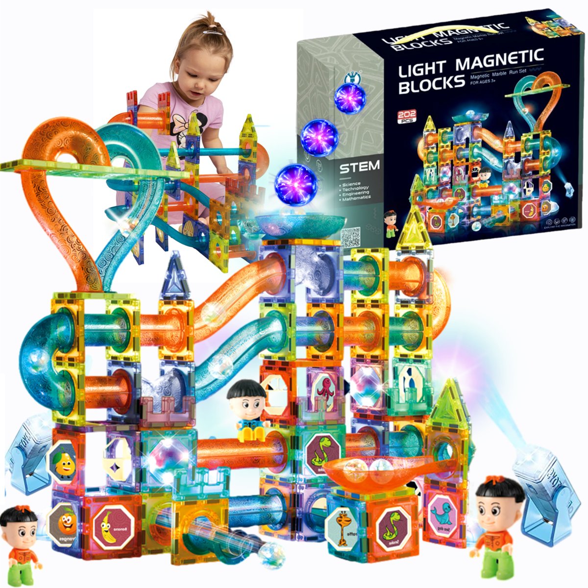 | Nazwa: | Świecące Klocki Magnetyczne, Świecący tor kulkowy, magnetycze klocki konstrukcyjne, kulodrom, duże panele, zestaw XXL + figurki, 202 elemnty |