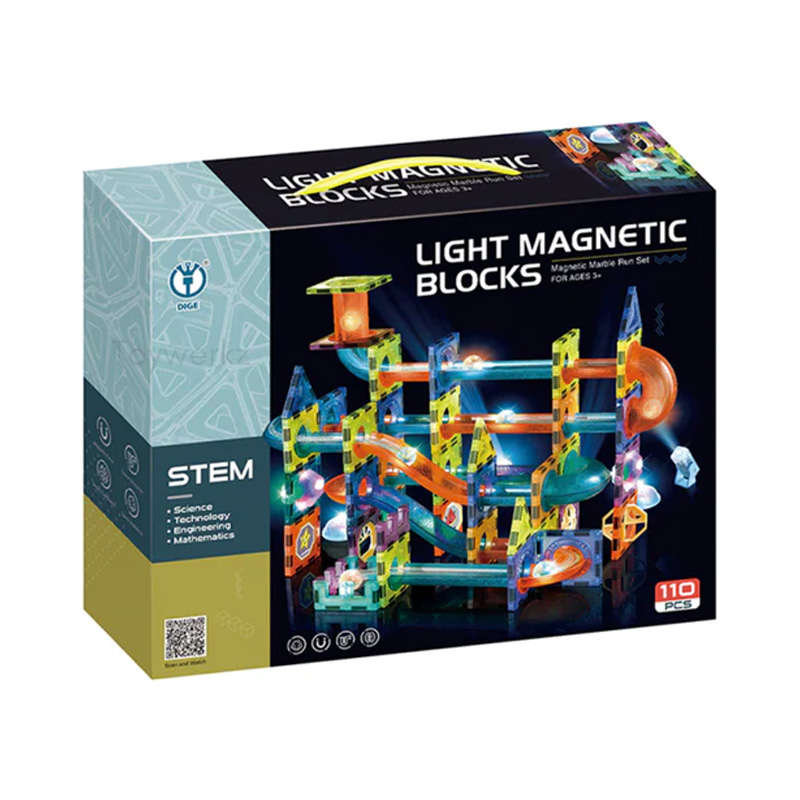 Klocki Magnetyczne - Light Magnetic Blocks to edukacyjna zabawka, która jednocześnie zapewnia bezpieczną i kreatywną zabawę. W skład zestawu wchodzi 110 różnorodnych elementów, takich jak klocki z wzorami, naklejki z różnymi motywami, tunele oraz figurki.