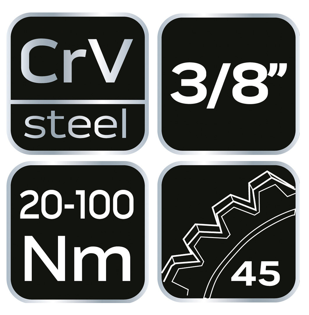 Klucz dynamometryczny 3/8" NEO (nr ref.08-824) o długości 420 mm, zakres 20-100 Nm, dokładność /- 4%.