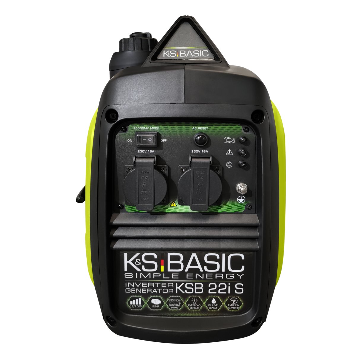 Generator inwerterowy KSB 22i S K&S Basic® w obudowie chroniącej przed hałasem o minimalnym poziomie hałasu Lpa (7m) = 62 dB idealne rozwiązanie do niezawodnej pracy wrażliwej i precyzyjnej elektroniki, komputerów, elektronicznych przyrządów pomiarowych, sprzętu medycznego, kotłów, elektronarzędzi itp. Wbudowany moduł elektroniczny sterowany mikroprocesorem kieruję pracą generatora, zapewnia najbardziej stabilną częstotliwość 50 Hz i napięcie 230 V.