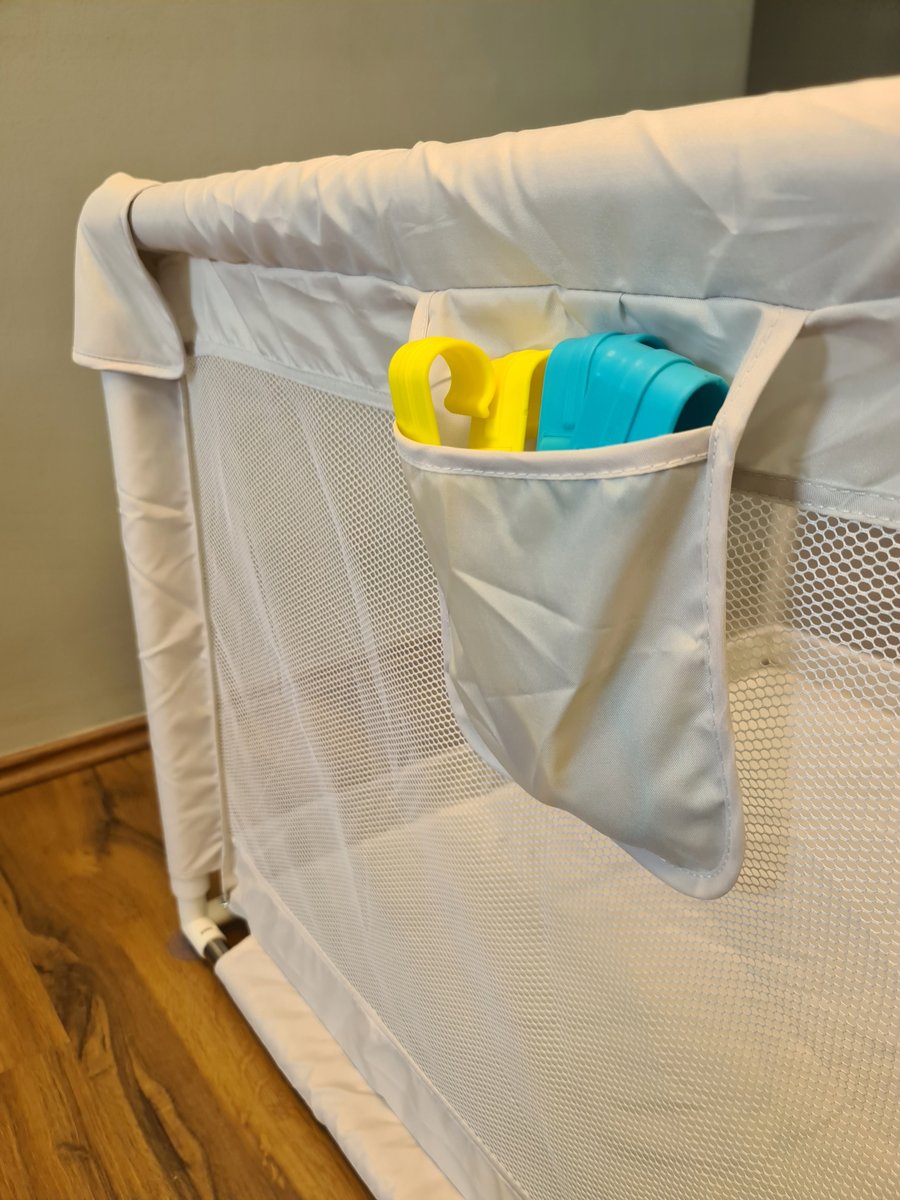Nasz zestaw zawiera dodatkowo dedykowaną torbę transportową w której możemy przewozić kojec np. podczas wakacji lub przechowywać złożony kojec np. dla kolejnego dziecka. Posiada również 4 uchwyty do nauki wstawania, kosz do zabawy oraz kieszonkę/organizer przyszyty na zewnątrz kojca.