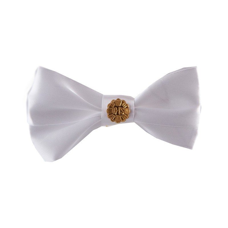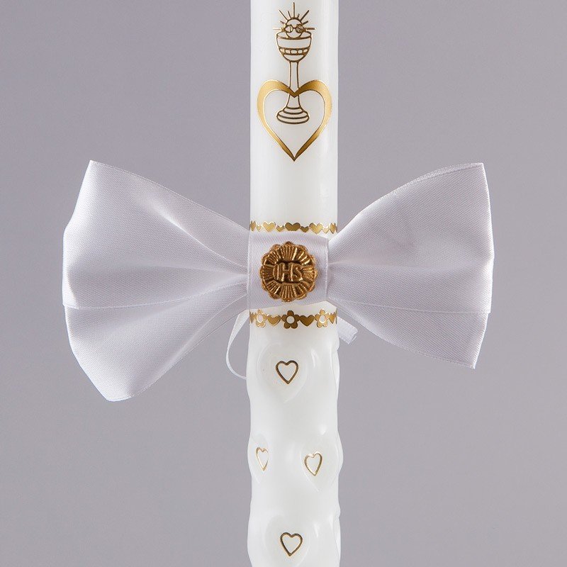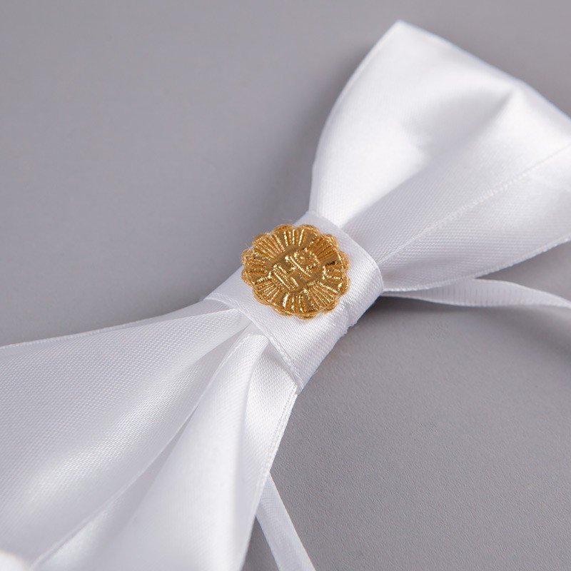Biała kokarda z motywem złotej hostii to przepiękny dodatek dekoracyjny z okazji Pierwszej Komunii Świętej dziecka. Może być ona wykorzystana jako ozdoba gromnicy, komunijnym krześle lub w inny, dowolny sposób!