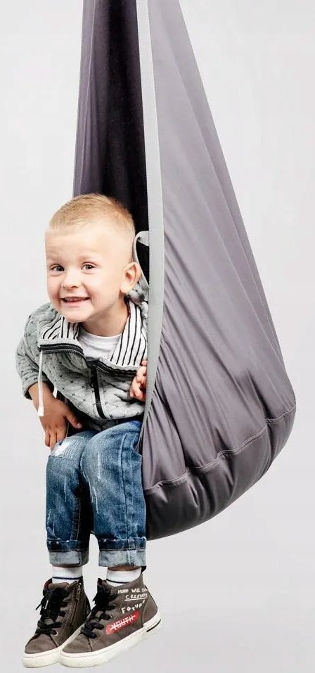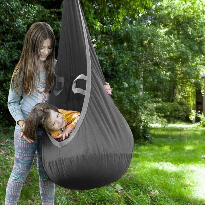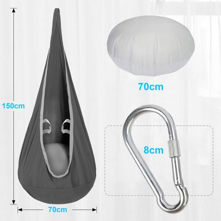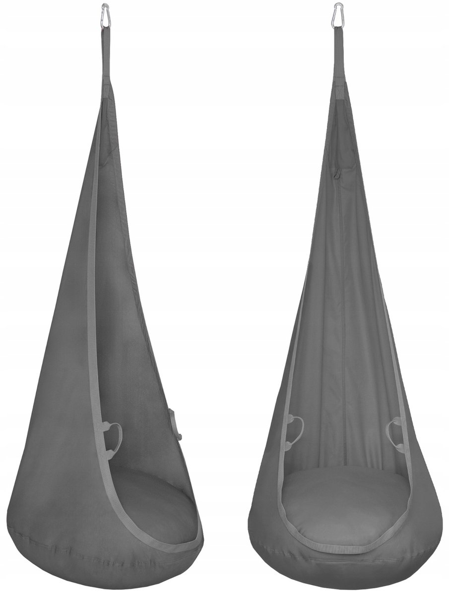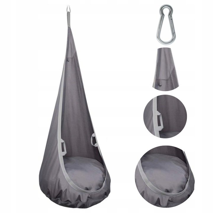 Wystarczy zawiesić kokon na przygotowanym zaczepie. Dzięki solidnemu pierścieniowi oraz uchwytom przy wejściu, Twoje dziecko może bezpiecznie wejść do środka i samodzielnie się ulokować